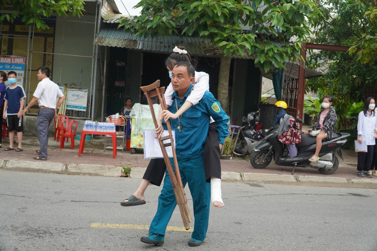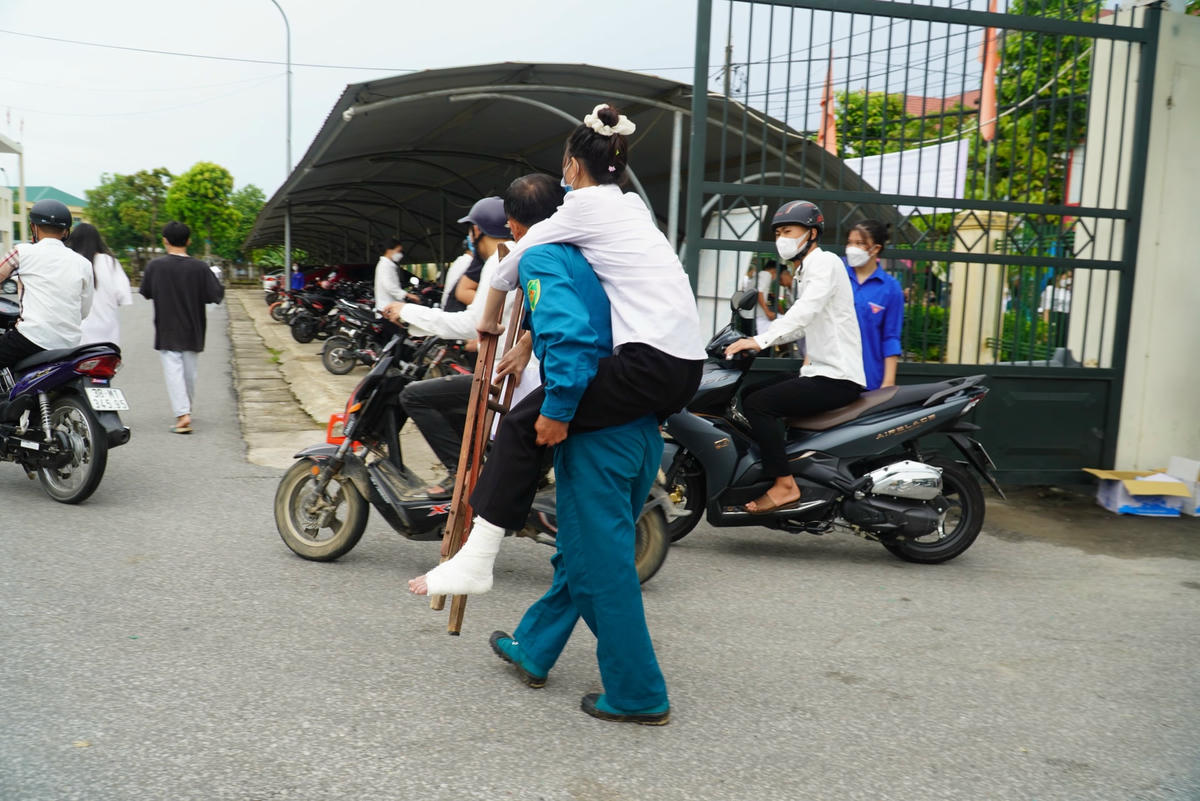 Cũng trong sáng nay, một số thí sinh bị thương do gặp tai nạn trước kỳ thi và thí sinh khuyết tật ở Hà Tĩnh cũng đã được các đội thanh niên tình nguyện đến tận nhà hỗ trợ nhiệt tình để đưa đón đến các điểm thi.