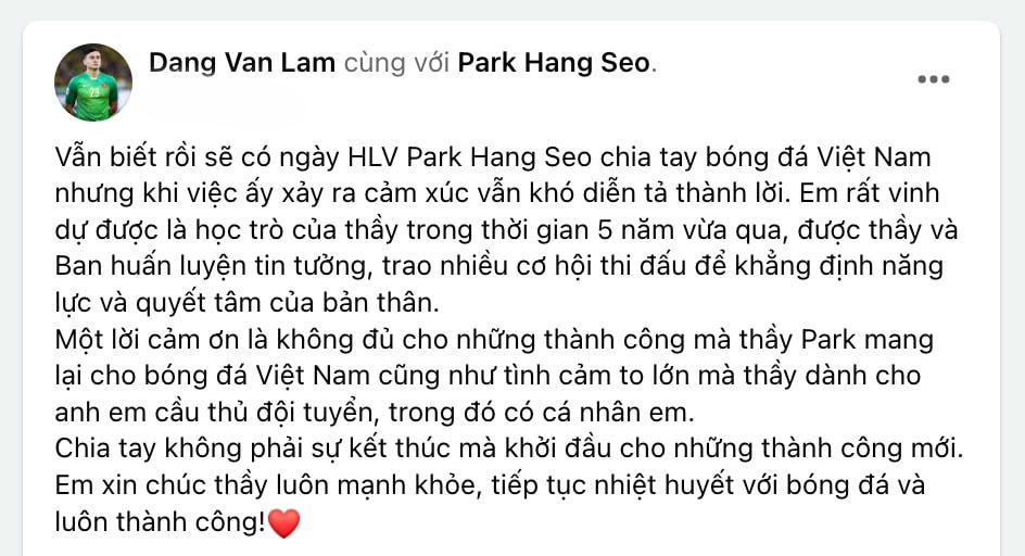 Chia tay không phải kết thúc mà là sự khởi đầu cho những thành công mới. Em xin chúc thầy luôn mạnh khỏe, tiếp tục nhiệt huyết với bóng đá và luôn thành công" - Thủ môn Đặng Văn Lâm viết.