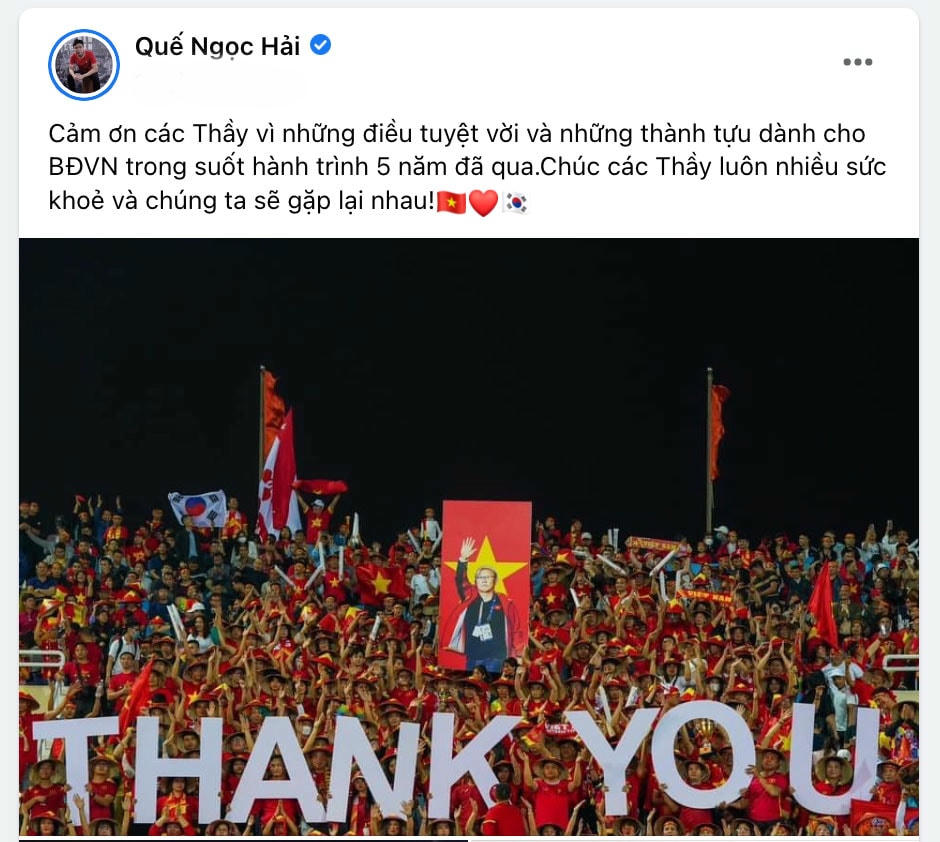 Trung vệ Quế Ngọc Hải thì trải lòng: "Cảm ơn các thầy vì những những thành tựu, những điều tuyệt vời dành cho bóng đá Việt Nam trong suốt hành trình 5 năm đã qua. Chúc các thầy luôn nhiều sức khỏe và chúng ta sẽ gặp lại nhau".