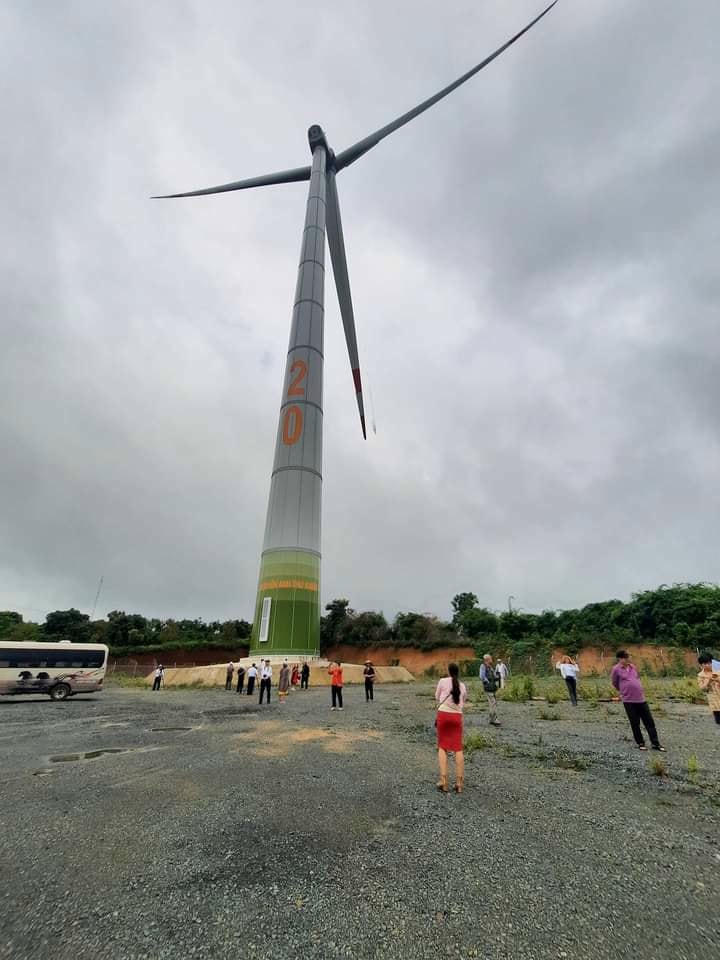 Lần đầu tiên chúng tôi được đứng dưới chân một turbine. Quả là “vĩ đại” và bỗng thấy mình quá nhỏ bé so với những “lực sĩ” trên cao nguyên này. Được biết, mỗi trụ turbine có chiều cao 120m, đường kính một cánh quạt những 180m. Dưới vòm trời cao nguyên đầy nắng và đầy gió những trụ turbine cao to giống như một chàng lực sĩ đang cần mẫn vung những cánh tay của mình. Tiếng cánh quạt xé gió kêu ù ù. Vậy mà khi còn chưa đứng ở đây nhìn những cánh quạt “thong thả” quay chúng tôi đã nghĩ “quay thế này sao tạo ra điện được?”.