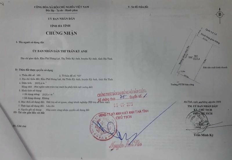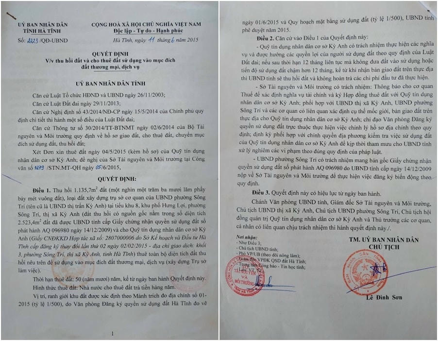 Quyết định 2223/QĐ-UBND của ông Lê Đình Sơn nêu rõ, UBND tỉnh Hà Tĩnh thu hồi 1.135,7 m2 tại UBND thị trấn Kỳ Anh cũ (địa chỉ tại tiểu khu 8, khối phố Hưng Lợi, phường Sông Trí, thị xã Kỳ Anh), cho Quỹ Tín dụng nhân dân cơ sở Kỳ Anh thuê để sử dụng vào mục đích đất thương mại, dịch vụ.