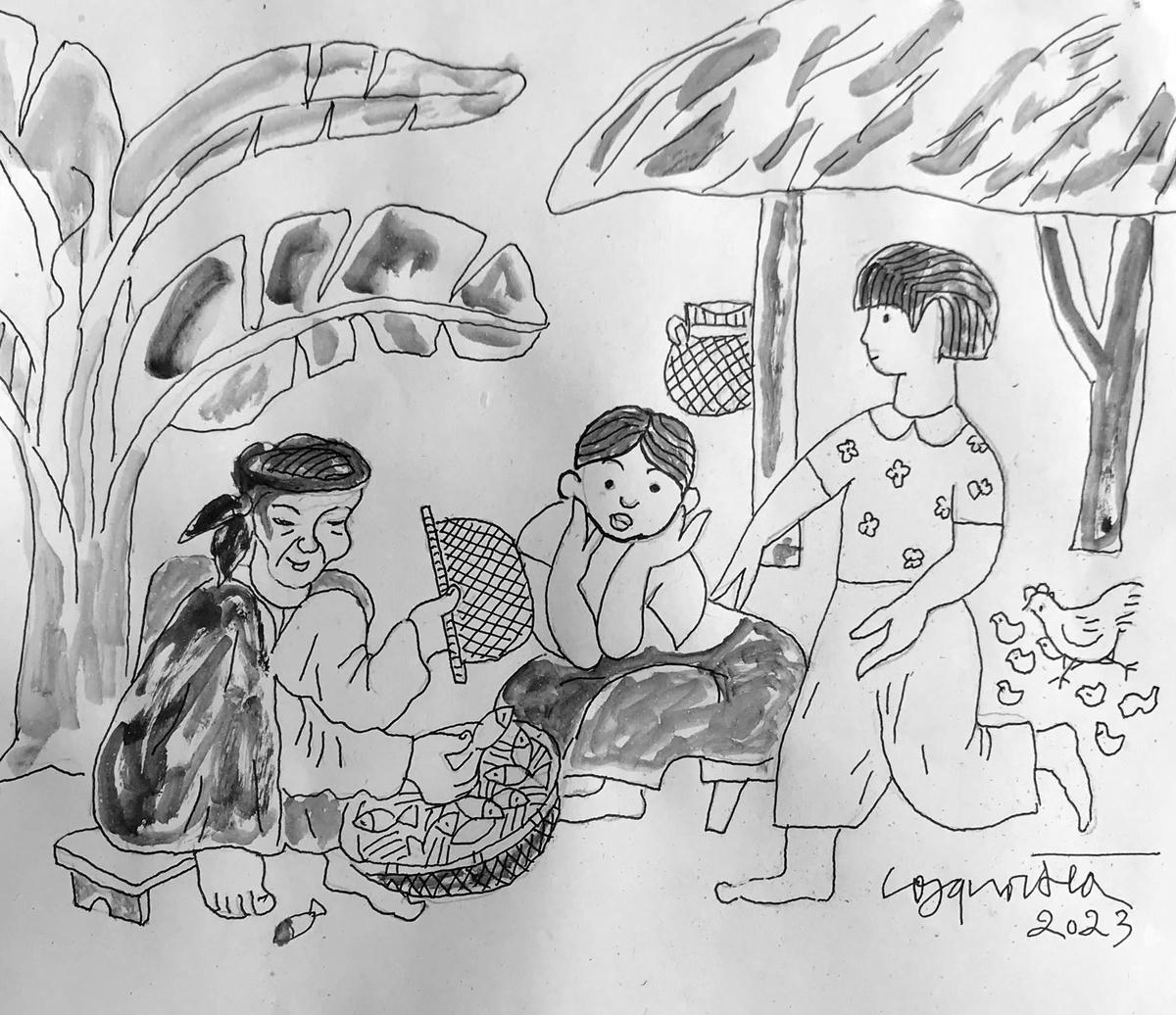 Mua được rổ tôm tép lép vế vì bé tí tị tì ti về, mang ra sông rửa đến lúc khoắng tay không thấy còn nước đục rồi, bà đặt cả rổ lên miếng lá chuối lót ở đầu hè, gọi bầy cháu ra giao việc. Rác rến còn sót nhặt ra. Từng con săn sắt, mài mại, đòng đong, cân cấn cũng được nhặt hết ra. Đấy là tép. Con tôm gạo tươi nguyên nhưng trắng đục chứ không trong mình như những con tôm khác, nhỉnh hơn đầu đũa tí cũng phải loại trừ.
