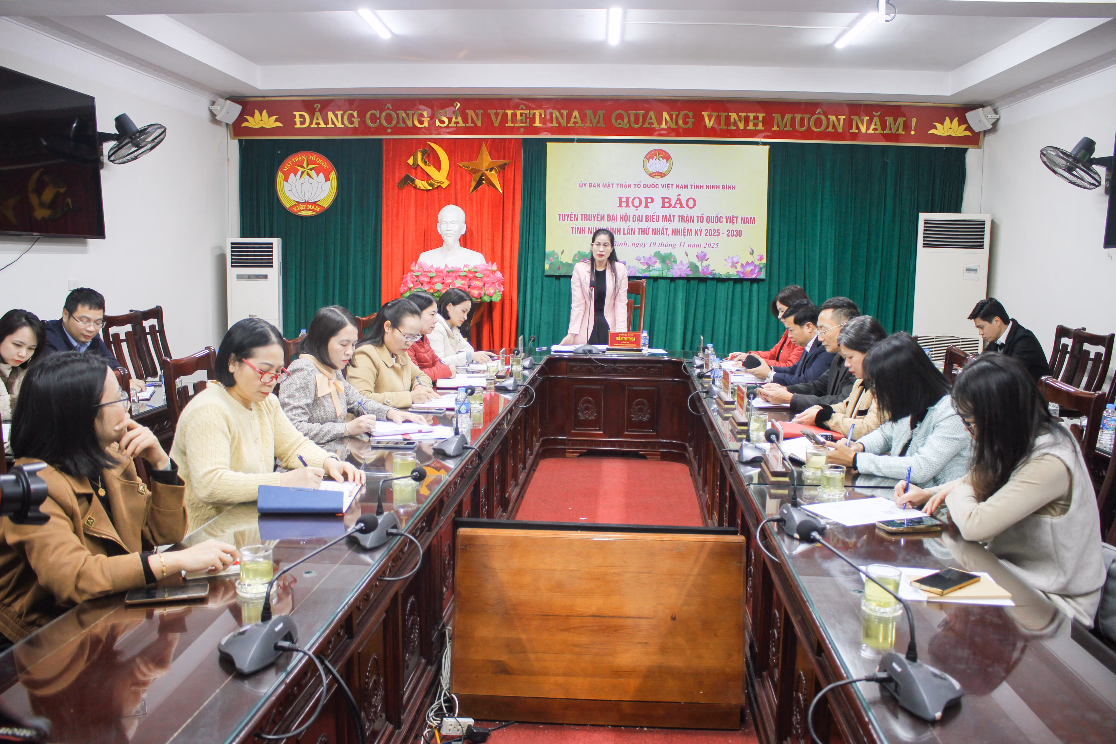 Mở đầu buổi họp báo, bà Trần Thị Thoa - Phó Chủ tịch Ủy ban MTTQ tỉnh Ninh Bình đã thông tin tới các đại biểu kết quả tổ chức Đại hội MTTQ cấp xã nhiệm kỳ 2024-2029; việc triển khai công tác chuẩn bị tổ chức Đại hội đại biểu MTTQ tỉnh lần thứ I, nhiệm kỳ 2025-2030; định hướng công tác tuyên truyền trước, trong và sau đại hội.