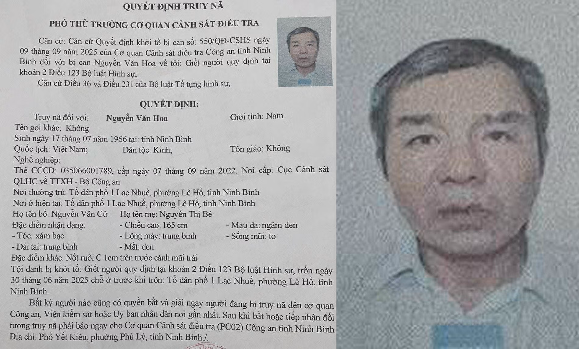 Ninh Bình: Truy nã đối tượng Nguyễn Văn Hoa về tội "Giết người"