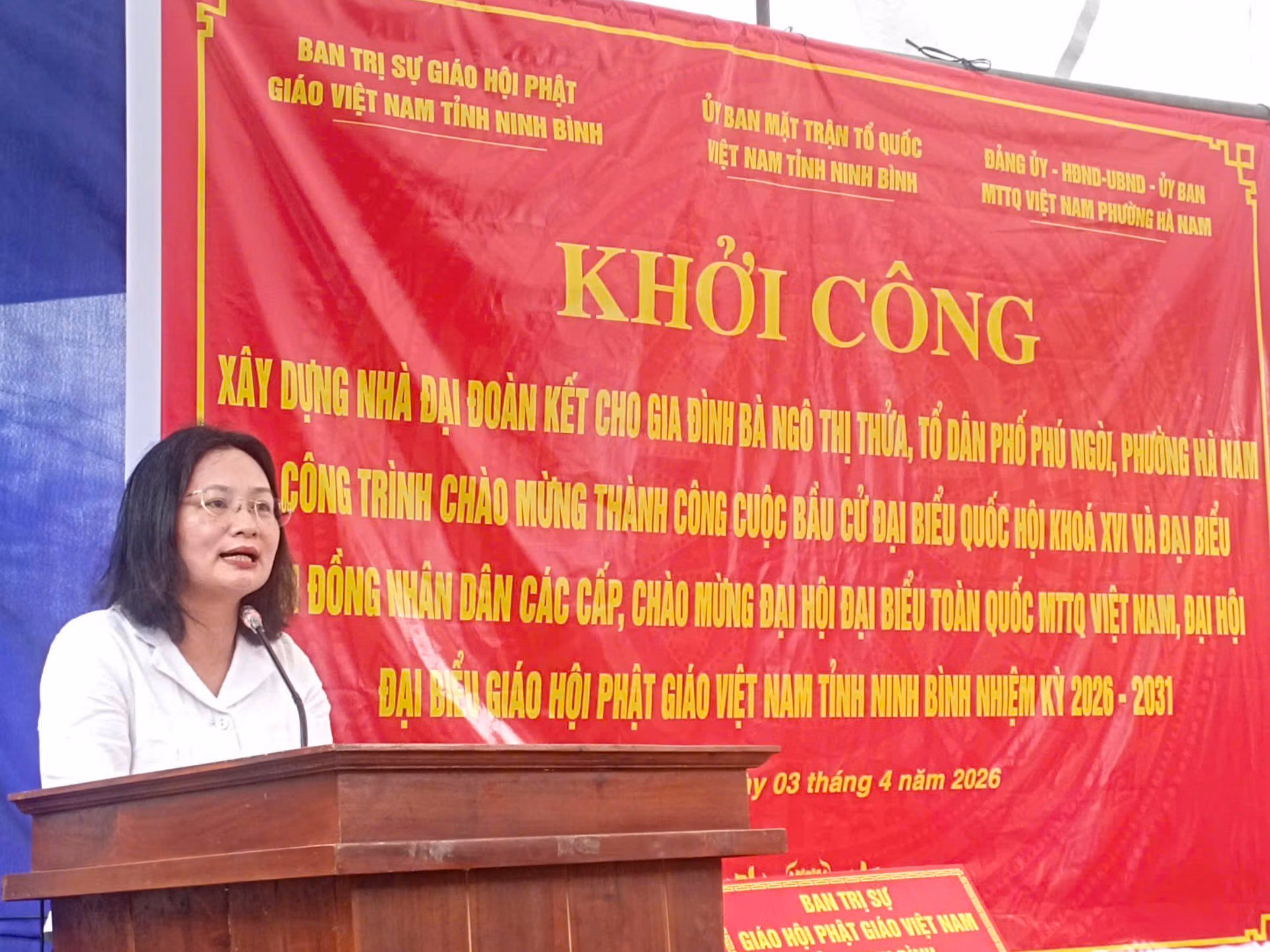 Phát biểu tại buổi lễ, bà Trần Thị Ngân - Phó Chủ tịch Ủy ban MTTQ tỉnh Ninh Bình cho biết, từ thiện ý hỗ trợ kinh phí xây dựng nhà Đại đoàn kết của Hòa thượng Thích Quảng Hà, MTTQ tỉnh đã phối hợp với cấp uỷ, chính quyền, MTTQ phường Hà Nam rà soát, lựa chọn đối tượng, đồng thời huy động thêm nguồn lực từ địa phương, các tổ chức tôn giáo, doanh nghiệp và nhà hảo tâm để khởi công xây dựng nhà cho bà Ngô Thị Thửa.