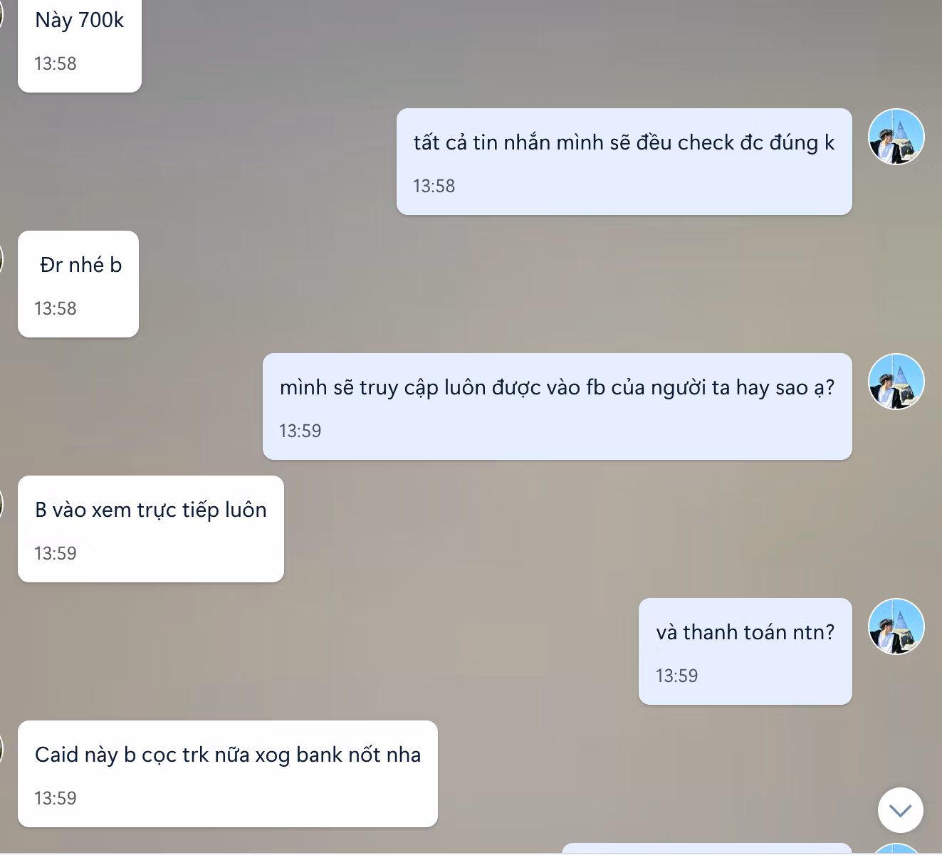 Cũng theo đối tượng này, thời gian để có thể thực hiện việc hack nick đối phương diễn ra rất nhanh chóng, chỉ cần chờ từ 30-60 phút sau khi thanh toán tiền cọc. Theo đó, người có nhu cầu đọc trộm tin nhắn phải chuyển khoản trước cho đối tượng số tiền từ 40-50%. Sau khi hack nick thành công và có thể đọc được tin nhắn sẽ thanh toán nốt số tiền còn lại.