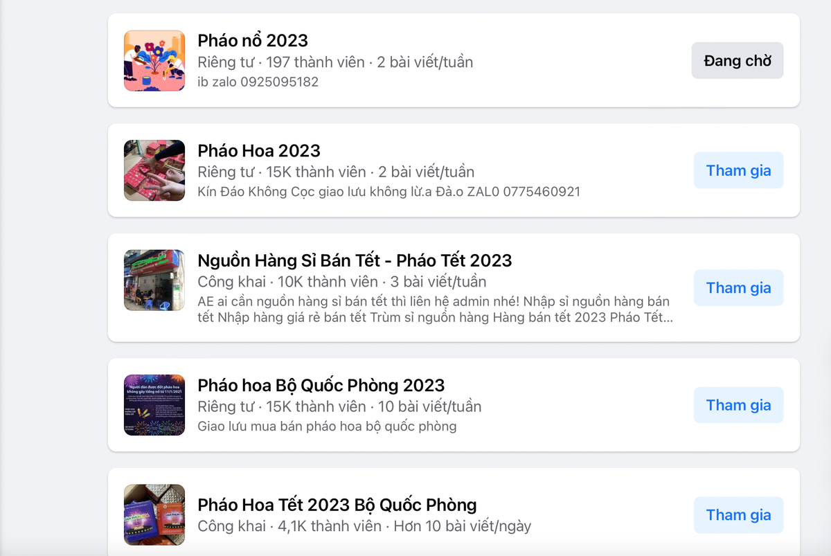 Từ khoảng 1 tháng nay, trên các hội nhóm mạng xã hội Facebook, tình trạng rao bán pháo hoa, pháo nổ diễn ra vô cùng sôi nổi. Theo khảo sát của PV Đại Đoàn Kết Online, có đến hơn chục hội nhóm có quảng cáo, rao bán pháo nổ trên Facebook với số lượng thành viên từ vài chục đến vài chục nghìn người. Lượng bài đăng cũng tăng lên từng ngày. Các đối tượng sẵn sàng để lại số điện thoại, Zalo,… để tiện liên lạc.