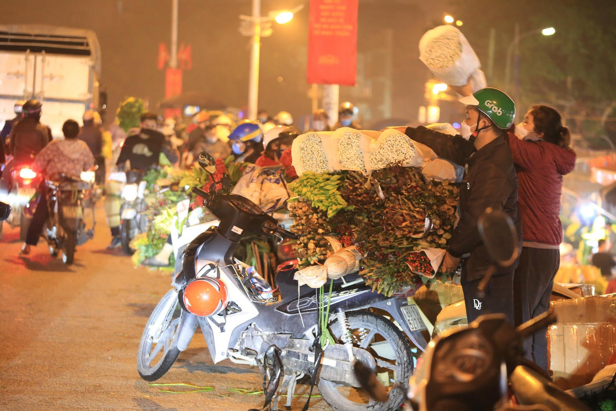 Chất đầy chiếc xe cà tàng, những người cửu vạn tại chợ hoa Quảng An, Hà Nội vẫn miệt mài gánh đủ các mặt hàng hoa. Phần lớn những gánh hàng chúng tôi tiếp cận đều của phụ nữ trung niên từ 40 - 60 tuổi.