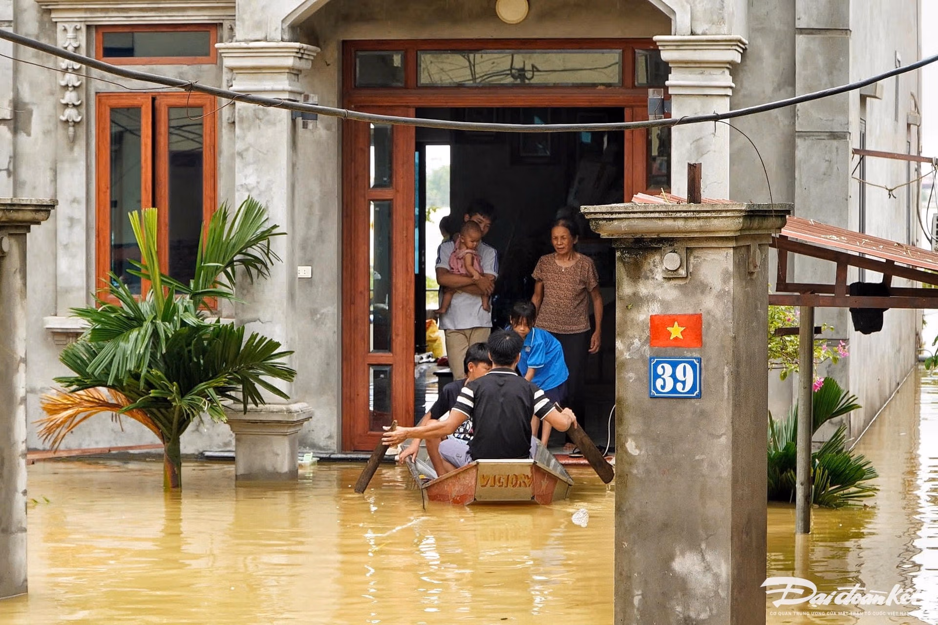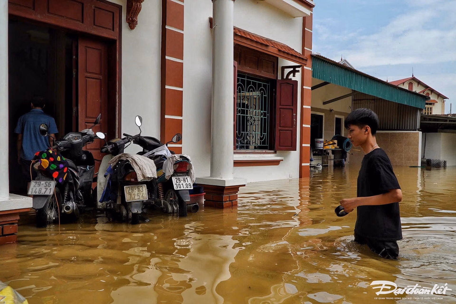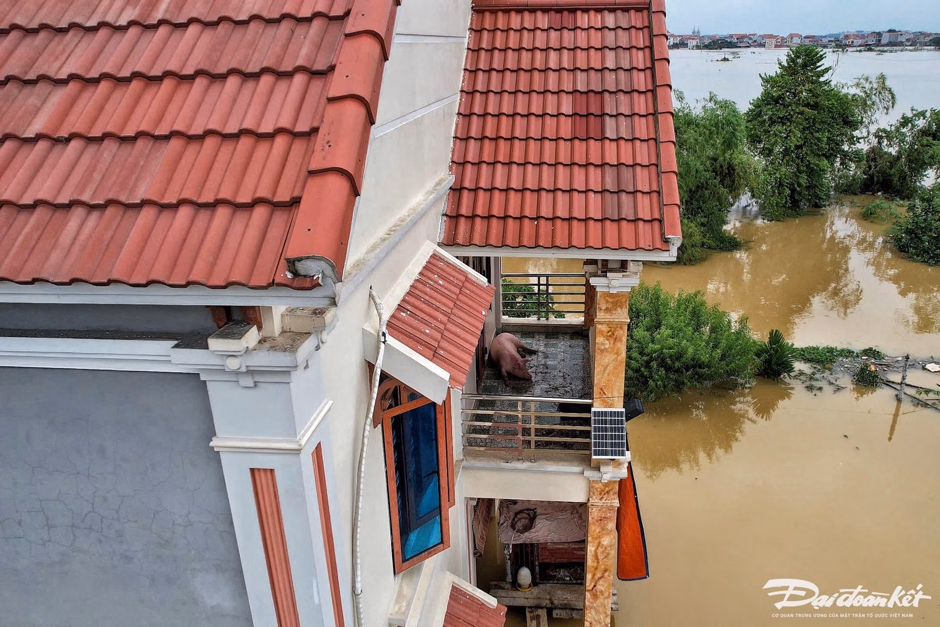 Nước ngập sâu gần 2 m, khiến 100 hộ dân gồm 300 người ở xóm Mom (xã Việt Long, huyện Sóc Sơn, Hà Nội) bị cô lập. Để vớt vát, người dân phải đưa gia cầm, gia súc lên trên tầng ở tạm chờ nước xuống.