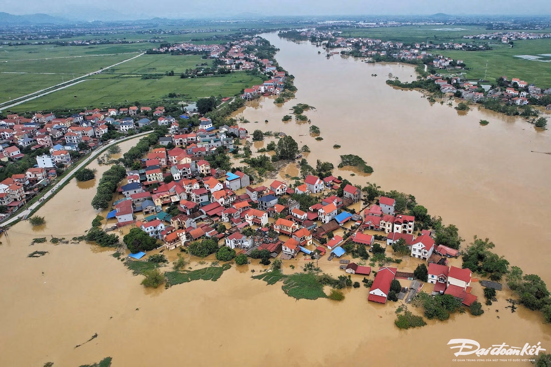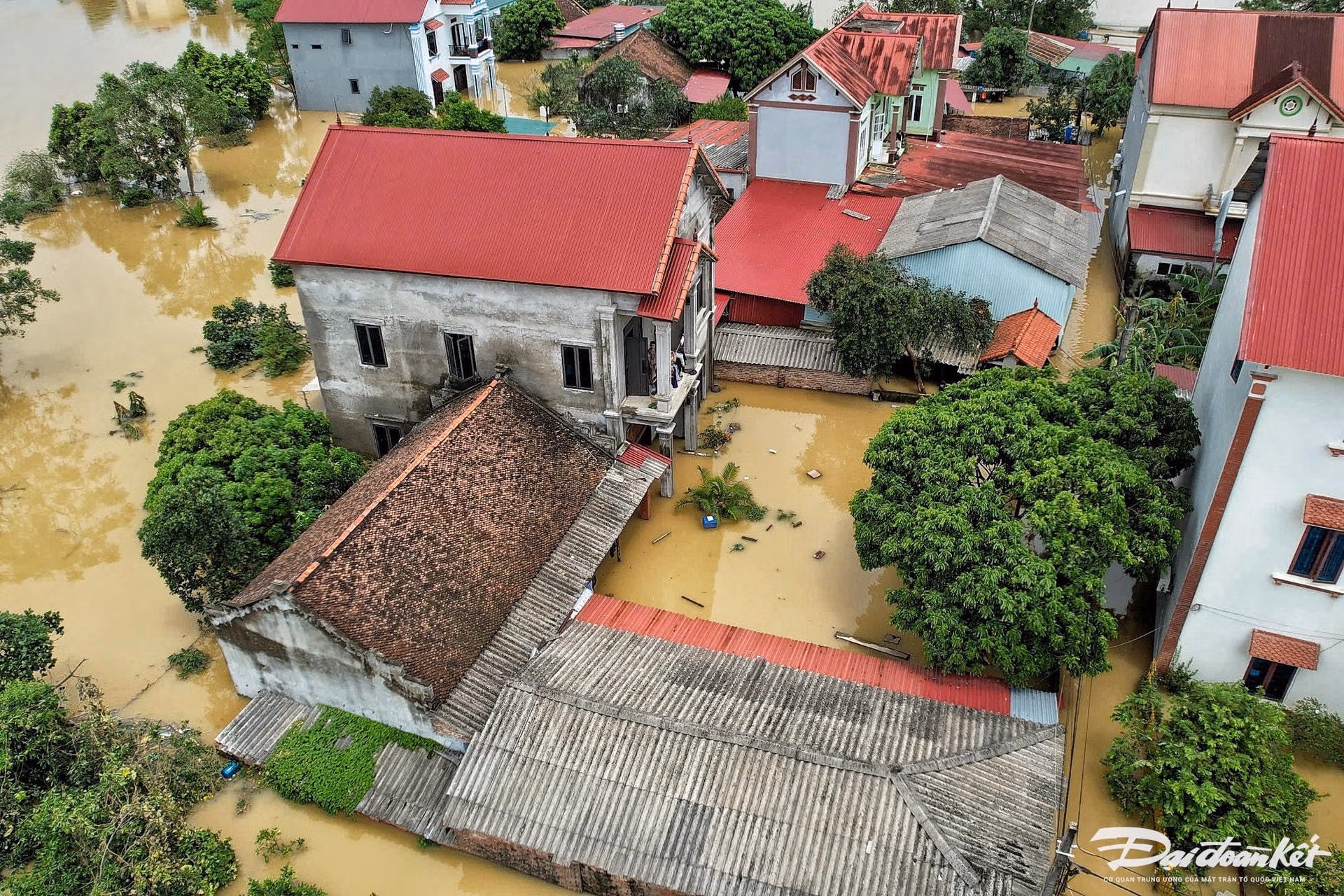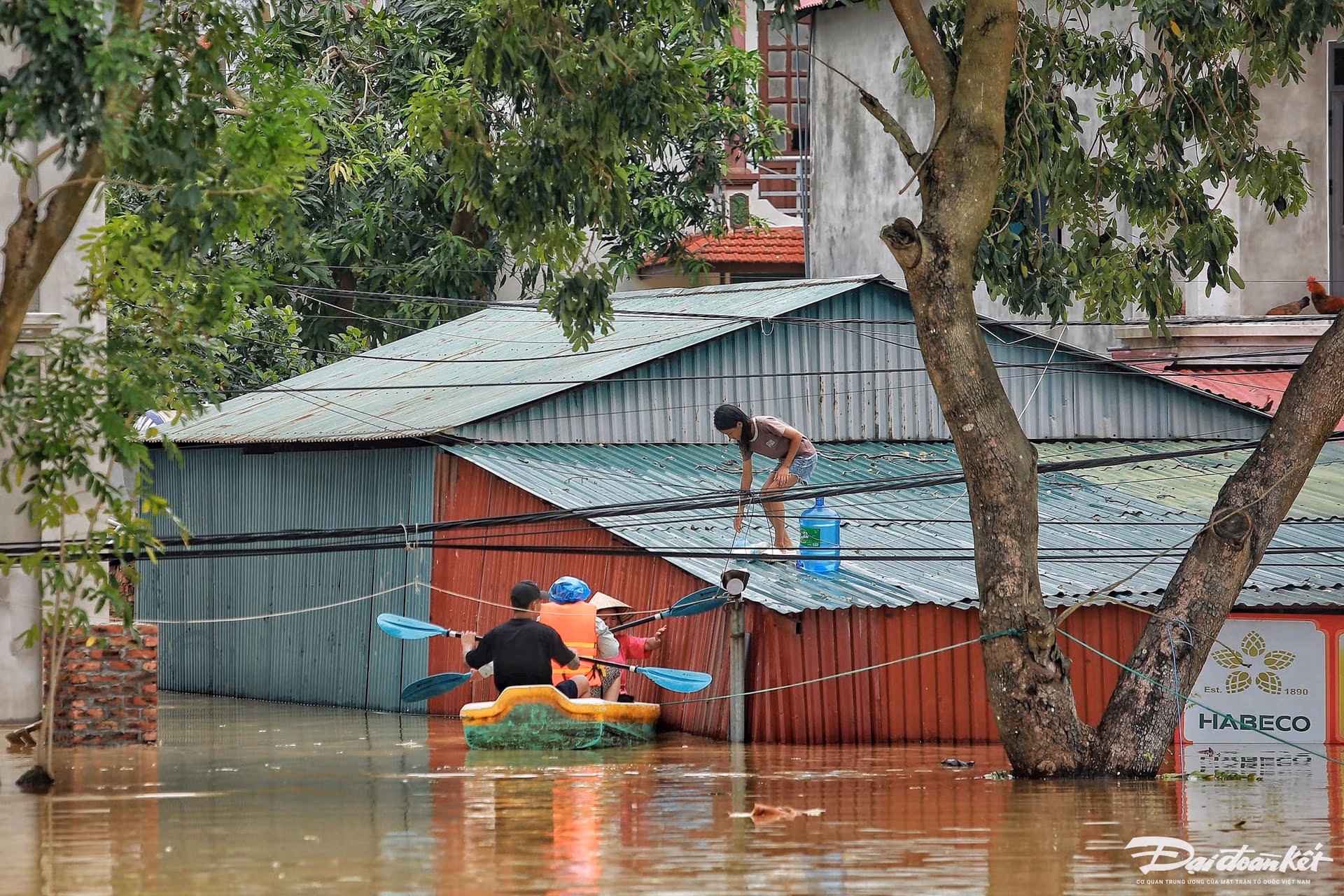 Nước ngập sâu gần 2 m, khiến 100 hộ dân gồm 300 người ở xóm Mom (xã Việt Long, huyện Sóc Sơn, Hà Nội) bị cô lập. Để vớt vát, người dân phải đưa gia cầm, gia súc lên trên tầng ở tạm chờ nước xuống.