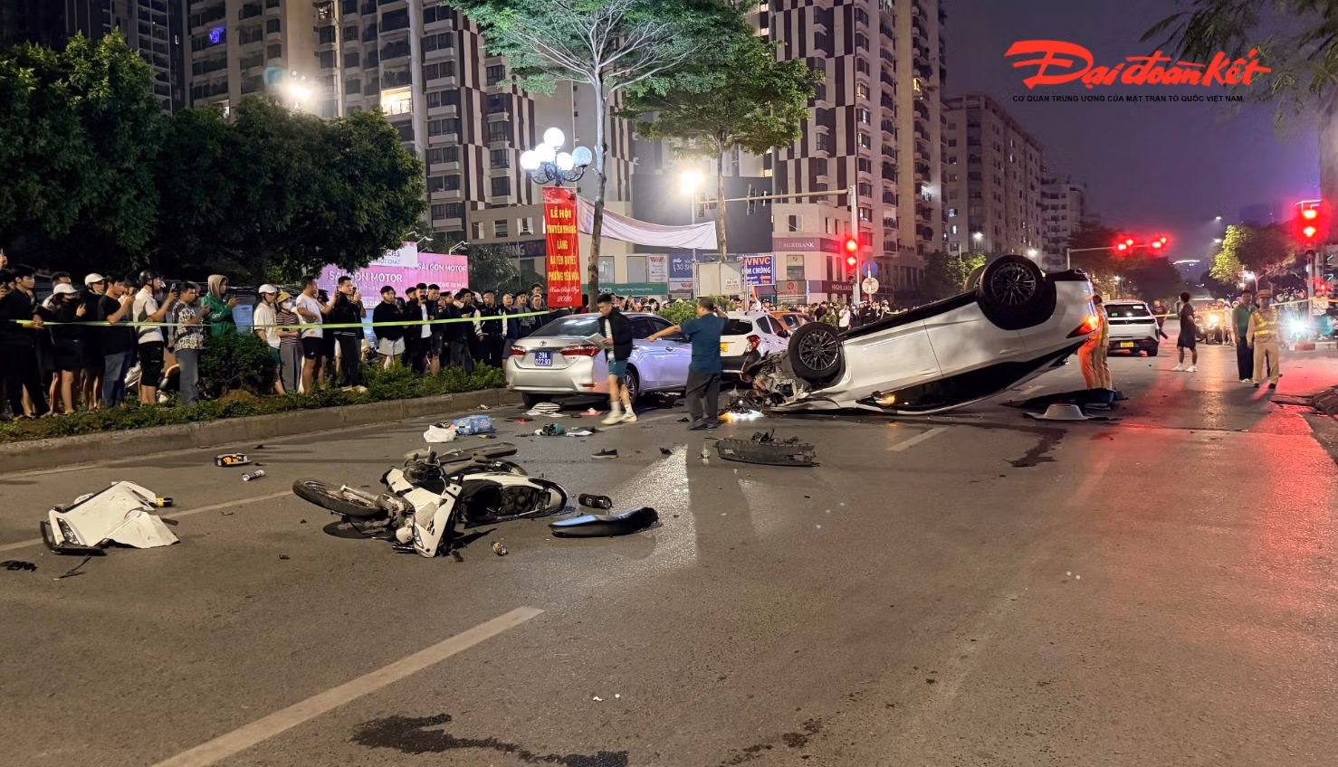 Sau cú va chạm ban đầu, chiếc Lexus tiếp tục lao sang làn đường ngược chiều, đâm liên tiếp vào 3 ô tô và 1 xe máy khác. Hậu quả, phương tiện này bị lật ngửa ngay trên đường.