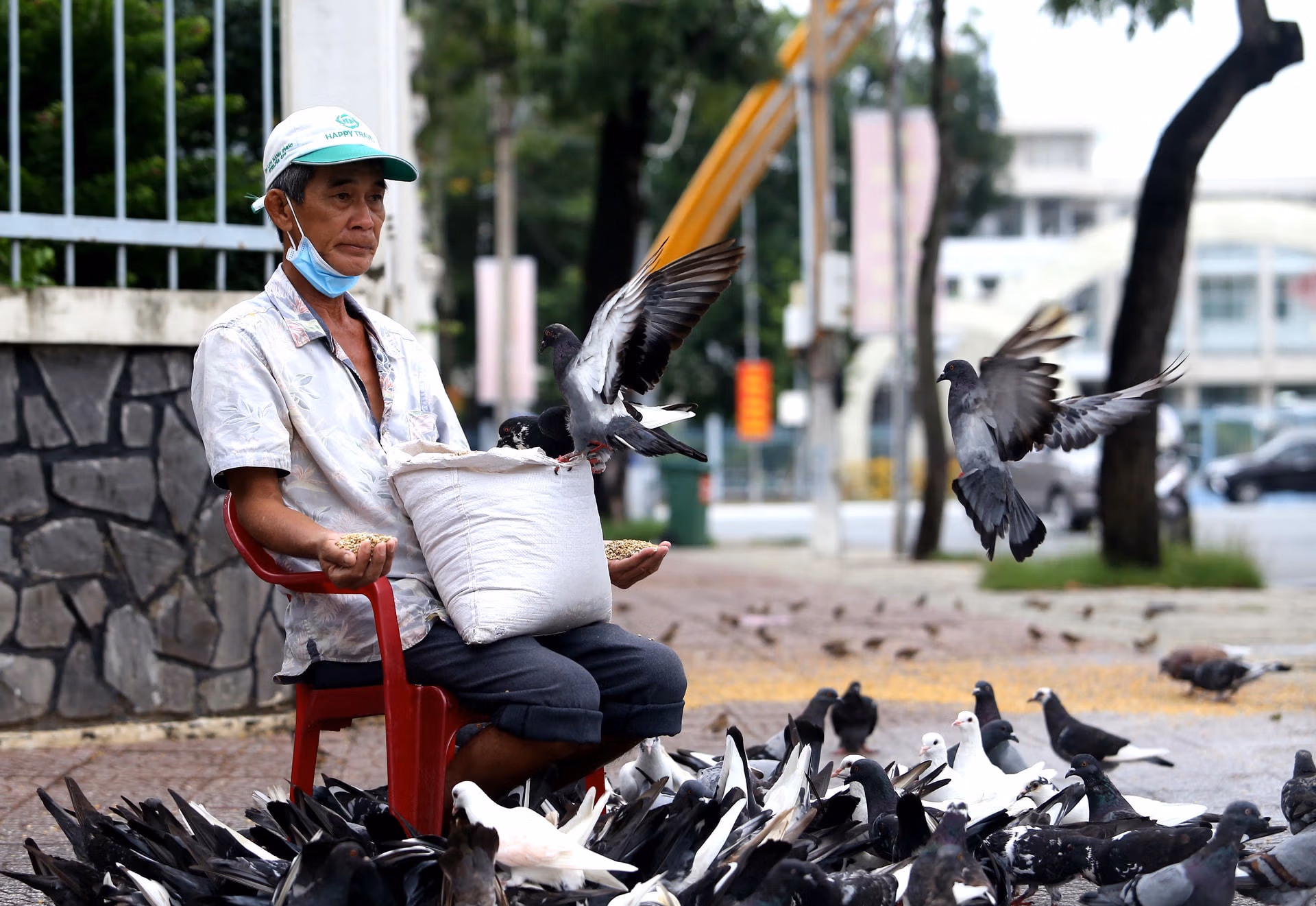 Tôi chạy xe Honda dọc đường Hòa Bình rồi tìm chỗ ngồi từ phía bên kia đường, âm thầm quan sát hình ảnh người đàn ông khoảng tuổi 60 đang cho đàn chim trời ăn. Hình ảnh rất thú vị khiến tôi không dám lại gần, sợ phá vỡ đi không khí bình yên ấy. Chờ cho đàn chim ăn no nê, bay đi chỗ khác tôi mới ghé lại để bắt chuyện với ông mong muốn được nghe câu chuyện của ông.