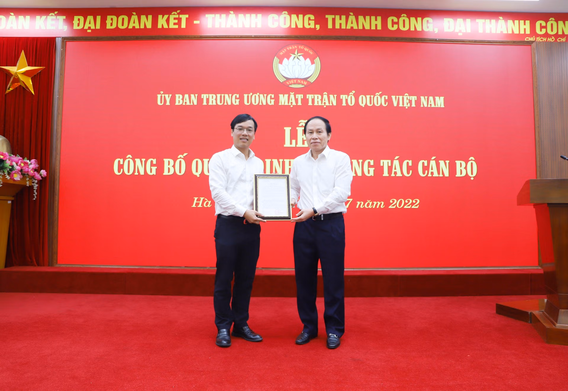 Được sự đồng ý của Đảng đoàn, Ban Thường trực UBTƯ MTTQ Việt Nam, Bí thư Trung ương Đảng, Chủ tịch UBTƯ MTTQ Việt Nam Đỗ Văn Chiến đã ký Quyết định số 1575/QĐ-BTT-MTTW ngày 26/7/2022 về việc tiếp nhận ông Nguyễn Bình Minh, 42 tuổi, Ủy viên Ban Thường vụ Trung ương Đoàn, Bí thư Đảng ủy, Chánh Văn phòng Trung ương Đoàn TNCS Hồ Chí Minh bổ nhiệm giữ chức vụ Chánh Văn phòng Cơ quan UBTƯ MTTQ Việt Nam. Thời gian bổ nhiệm là 5 năm, kể từ ngày 1/8/2022.