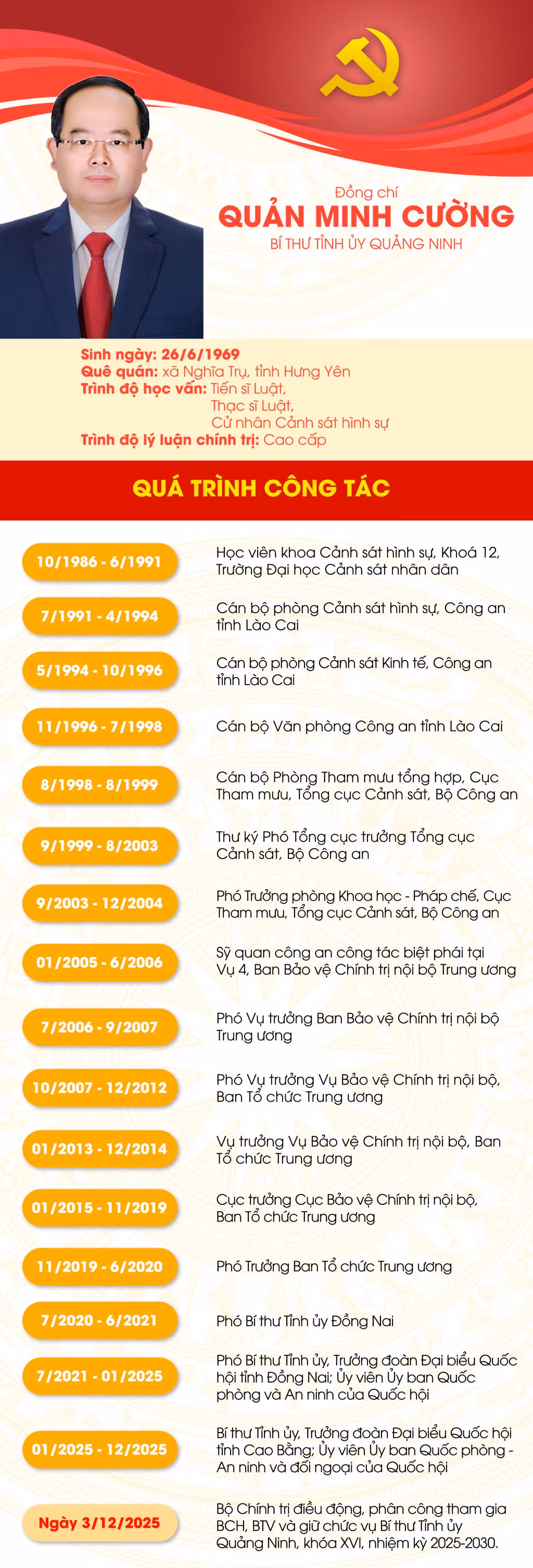 Tại hội nghị, Ban Tổ chức Trung ương đã công bố Quyết định số 2568-QĐNS/TW, ngày 28/11/2025 của Bộ Chính trị quyết định điều động ông Quản Minh Cường thôi tham gia Ban Chấp hành, Ban Thường vụ Tỉnh ủy và thôi giữ chức Bí thư Tỉnh ủy Cao Bằng nhiệm kỳ 2025 - 2030; điều động, chỉ định tham gia Ban Chấp hành, Ban Thường vụ Tỉnh ủy, giữ chức vụ Bí thư Tỉnh ủy Quảng Ninh nhiệm kỳ 2025 - 2030 và chỉ định tham gia Đảng ủy Quân khu 3.