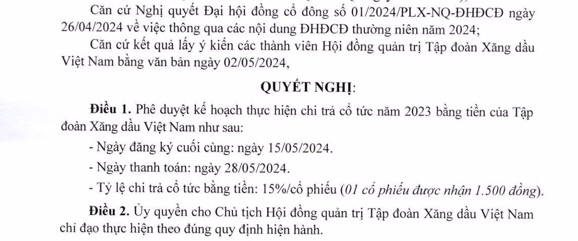 Ngày 4/5, HĐQT Tập đoàn Xăng dầu Việt Nam (Petrolimex, MCK: PLX, sàn HoSE) đã thông qua Nghị quyết số 108/PLX-NQ-HĐQT về việc thực hiện chi trả cổ tức năm 2023 bằng tiền.