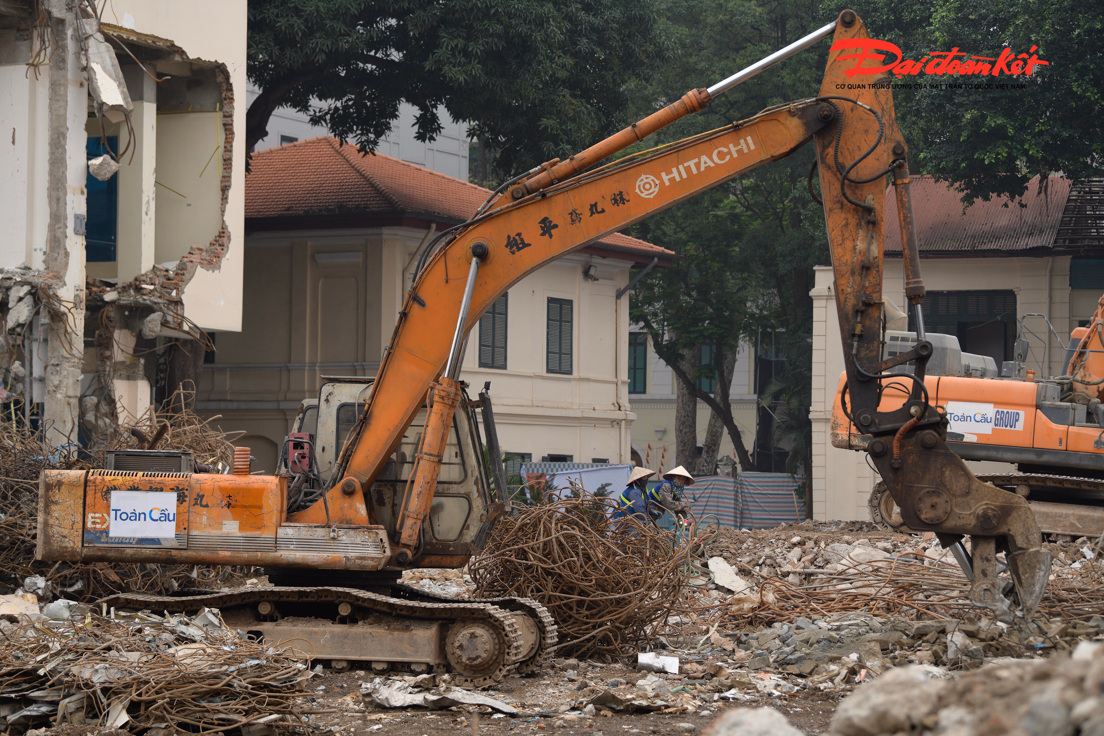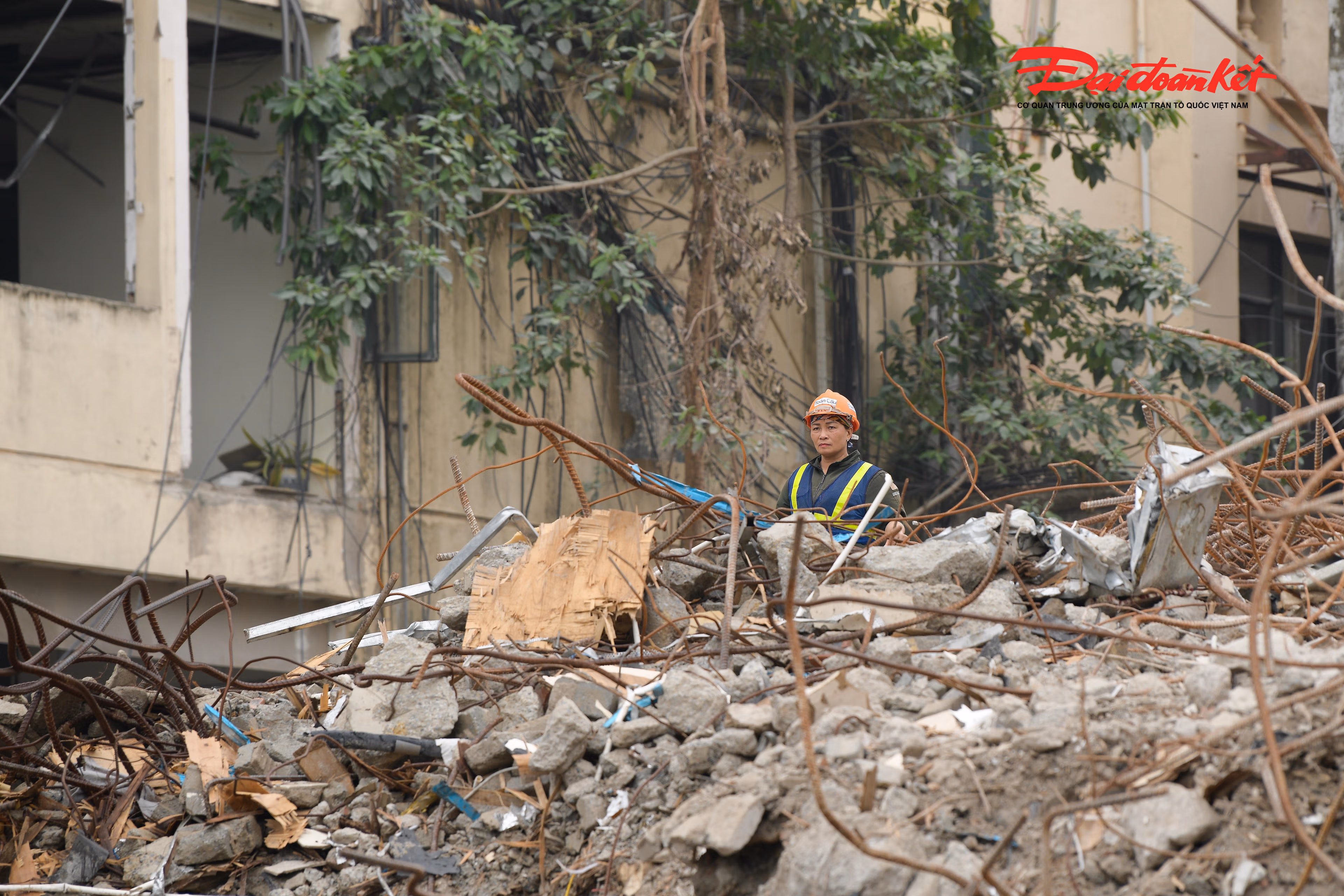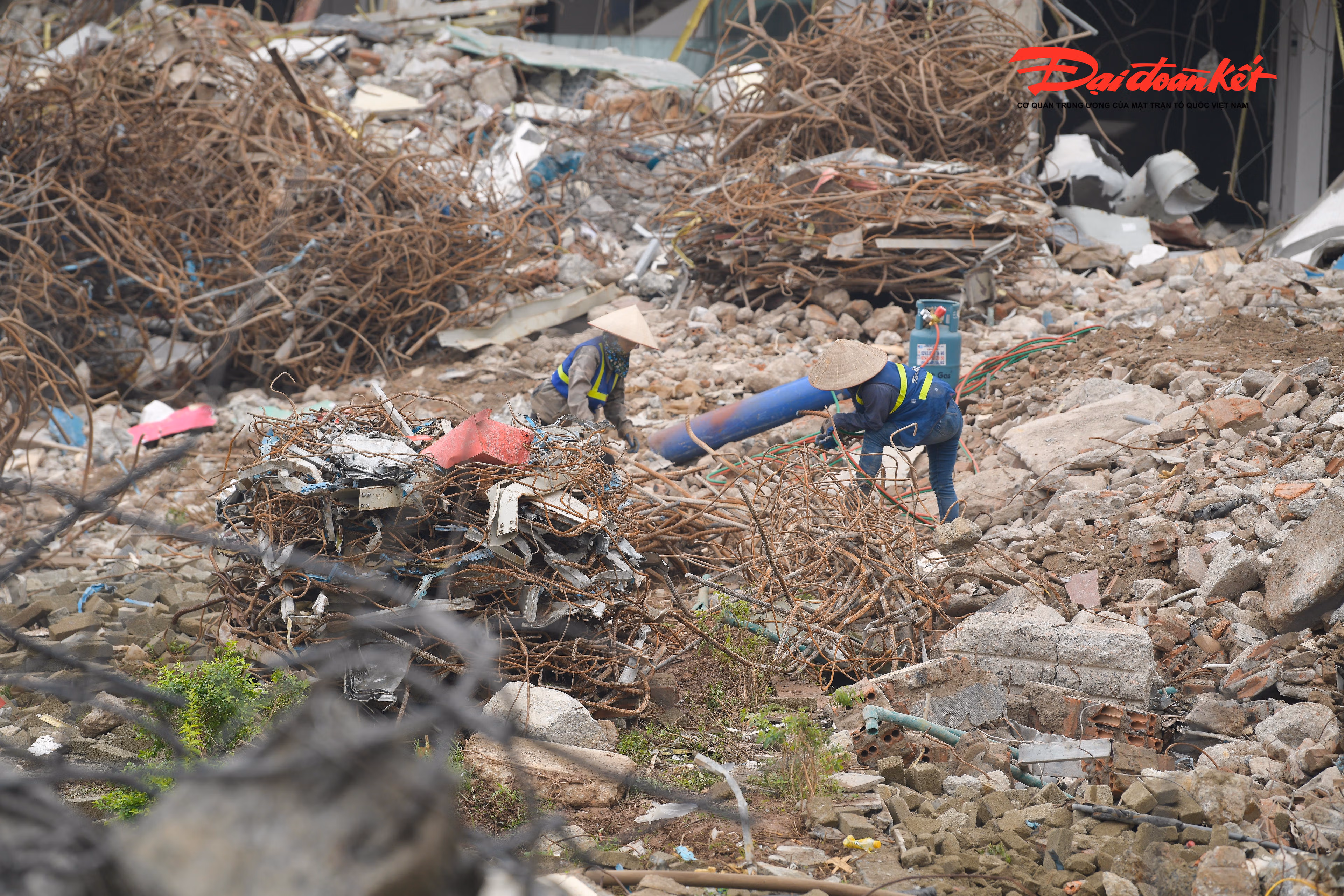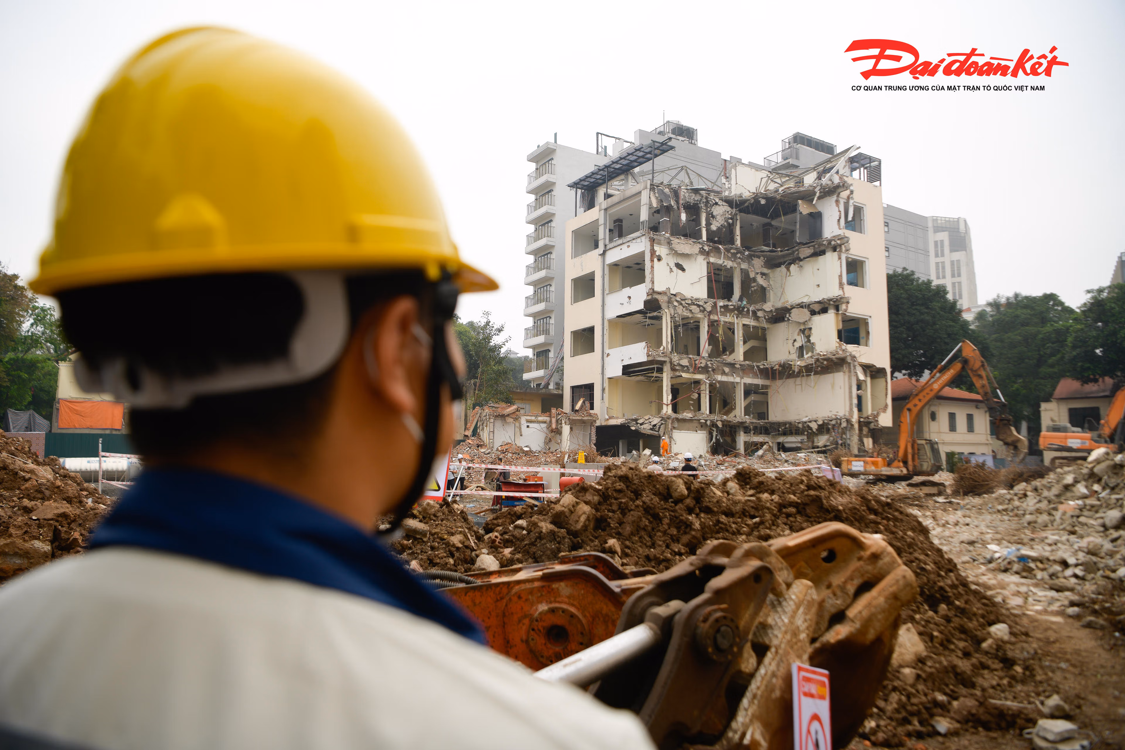 Tại công trường, công nhân làm việc liên tục, phối hợp nhịp nhàng với các phương tiện, máy móc chuyên dụng để xử lý, thu gom và di chuyển vật liệu sau phá dỡ, bảo đảm tiến độ và giữ gìn an toàn trong suốt quá trình thi công.