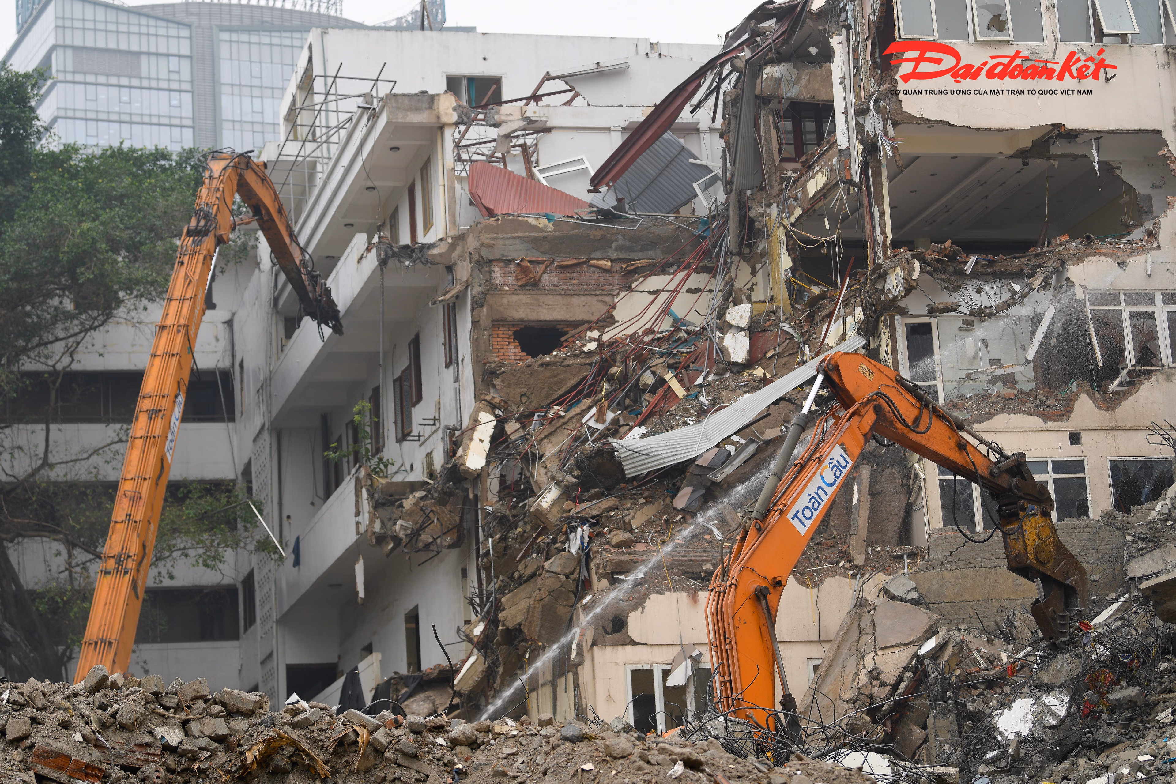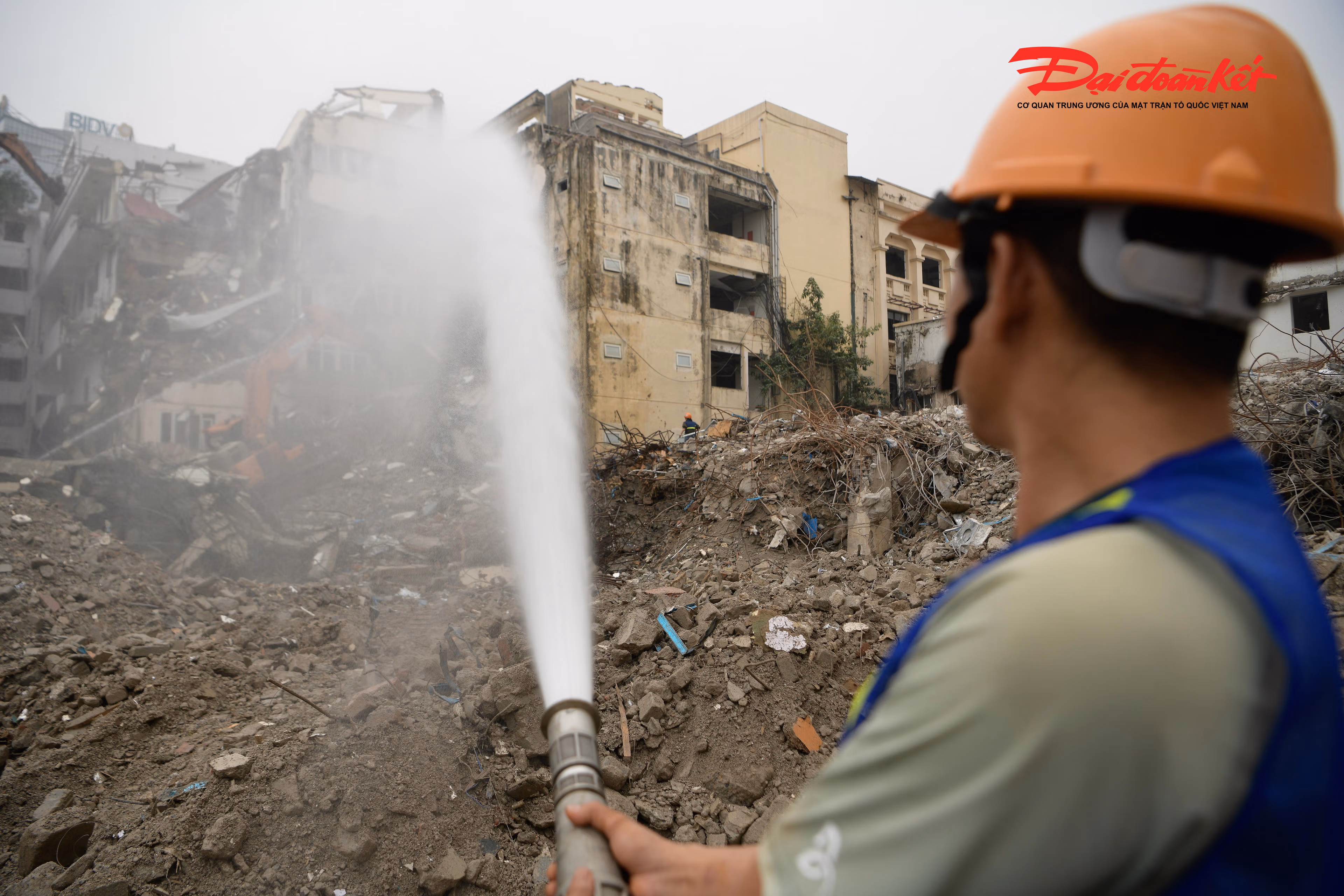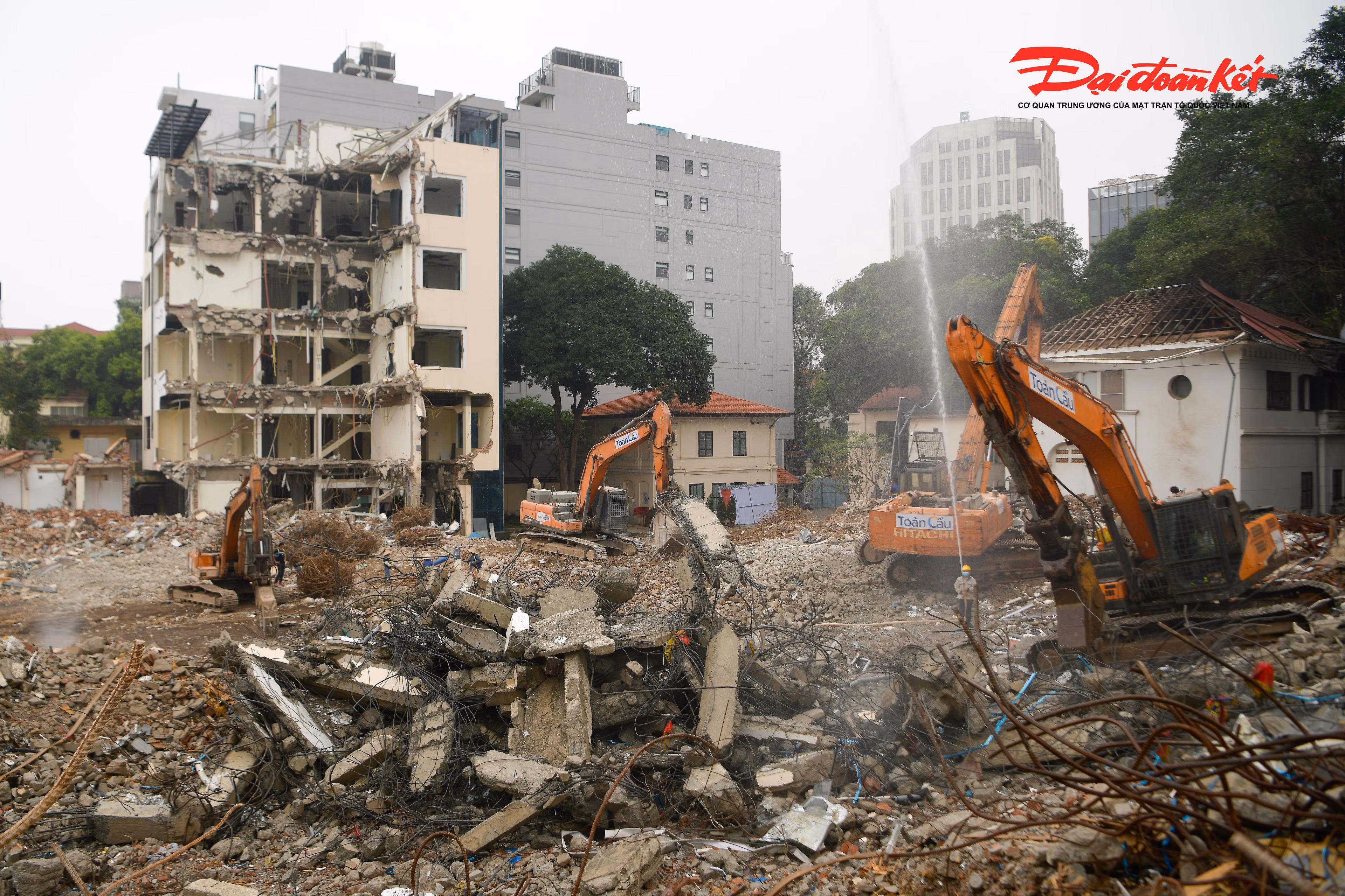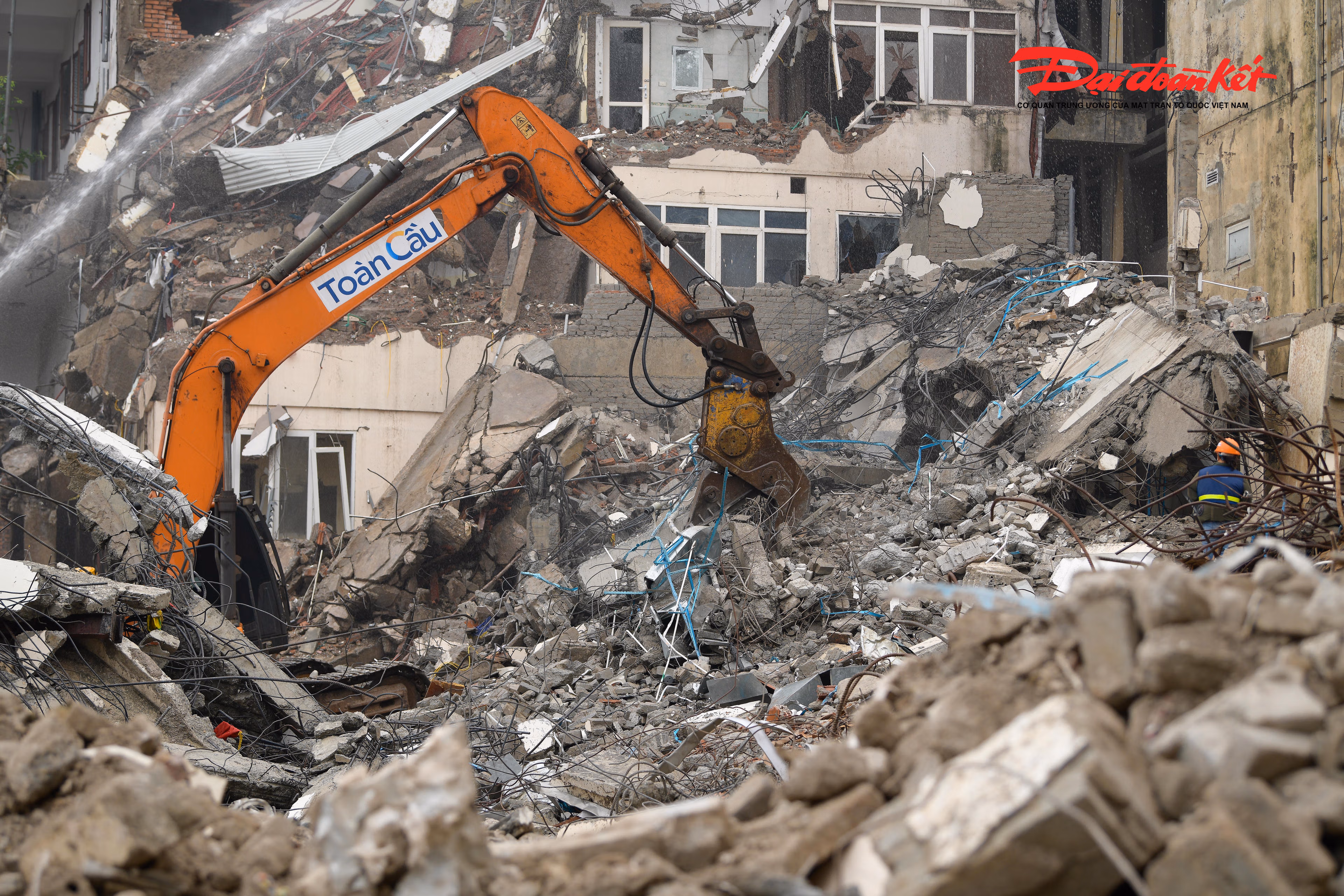 Tại công trường, công nhân làm việc liên tục, phối hợp nhịp nhàng với các phương tiện, máy móc chuyên dụng để xử lý, thu gom và di chuyển vật liệu sau phá dỡ, bảo đảm tiến độ và giữ gìn an toàn trong suốt quá trình thi công.