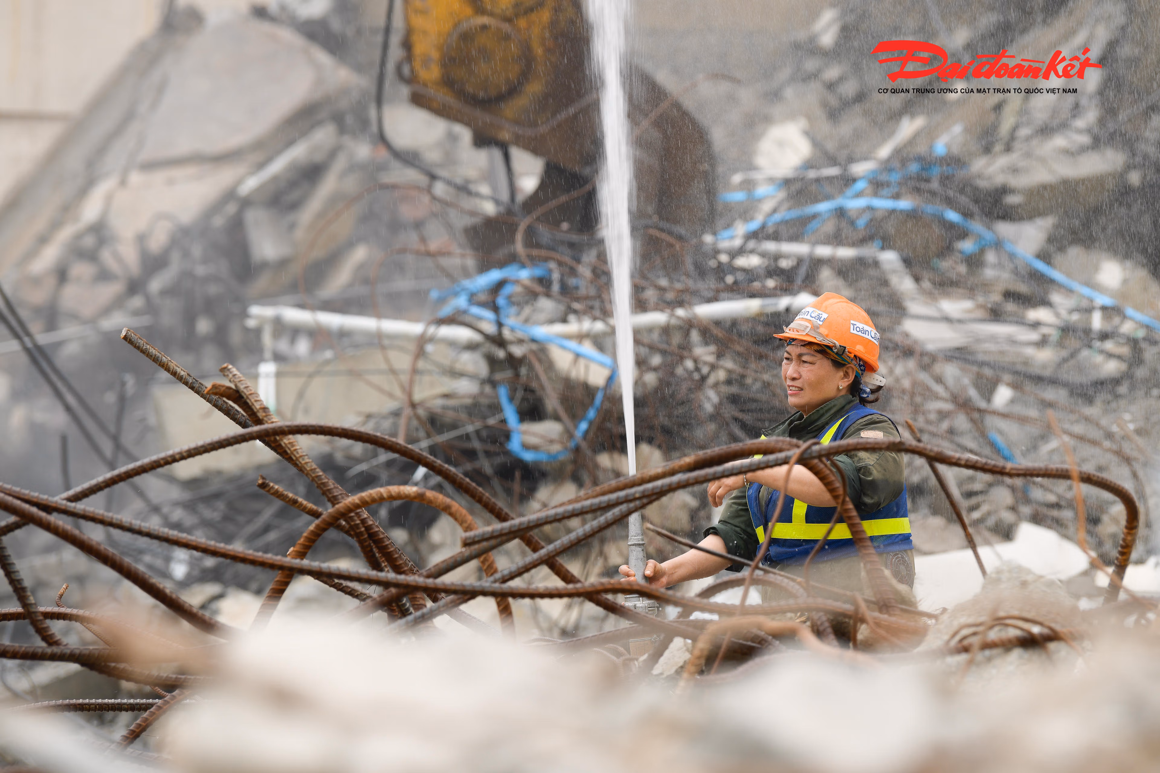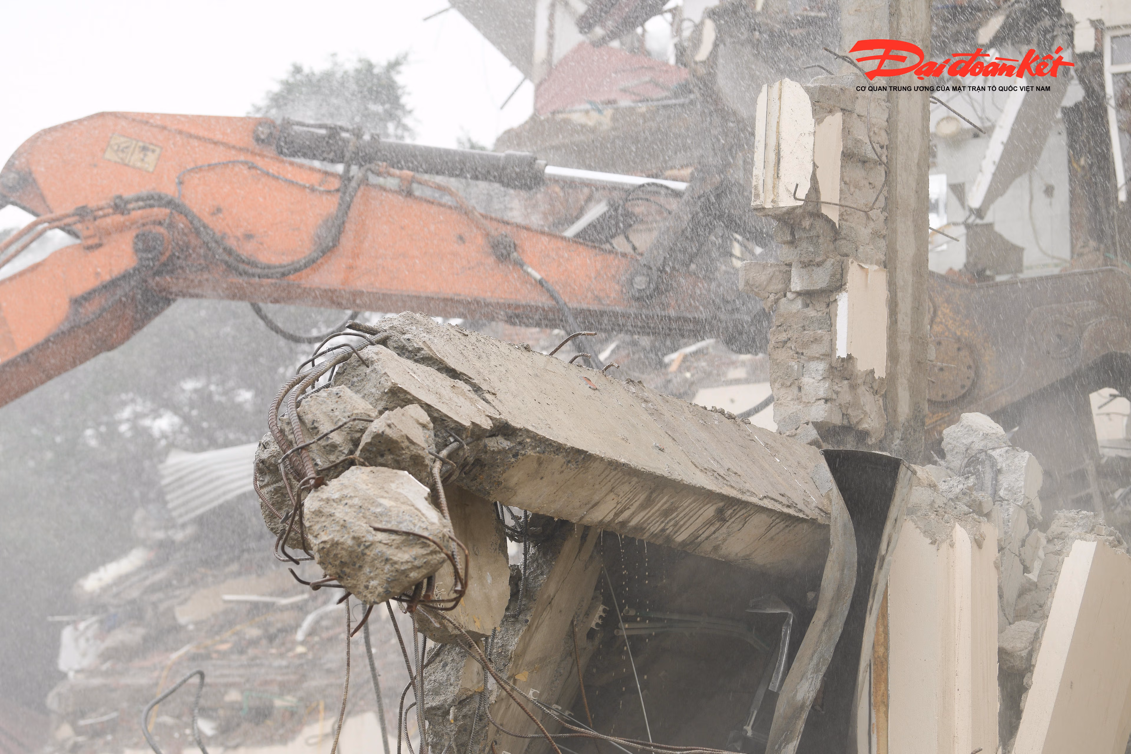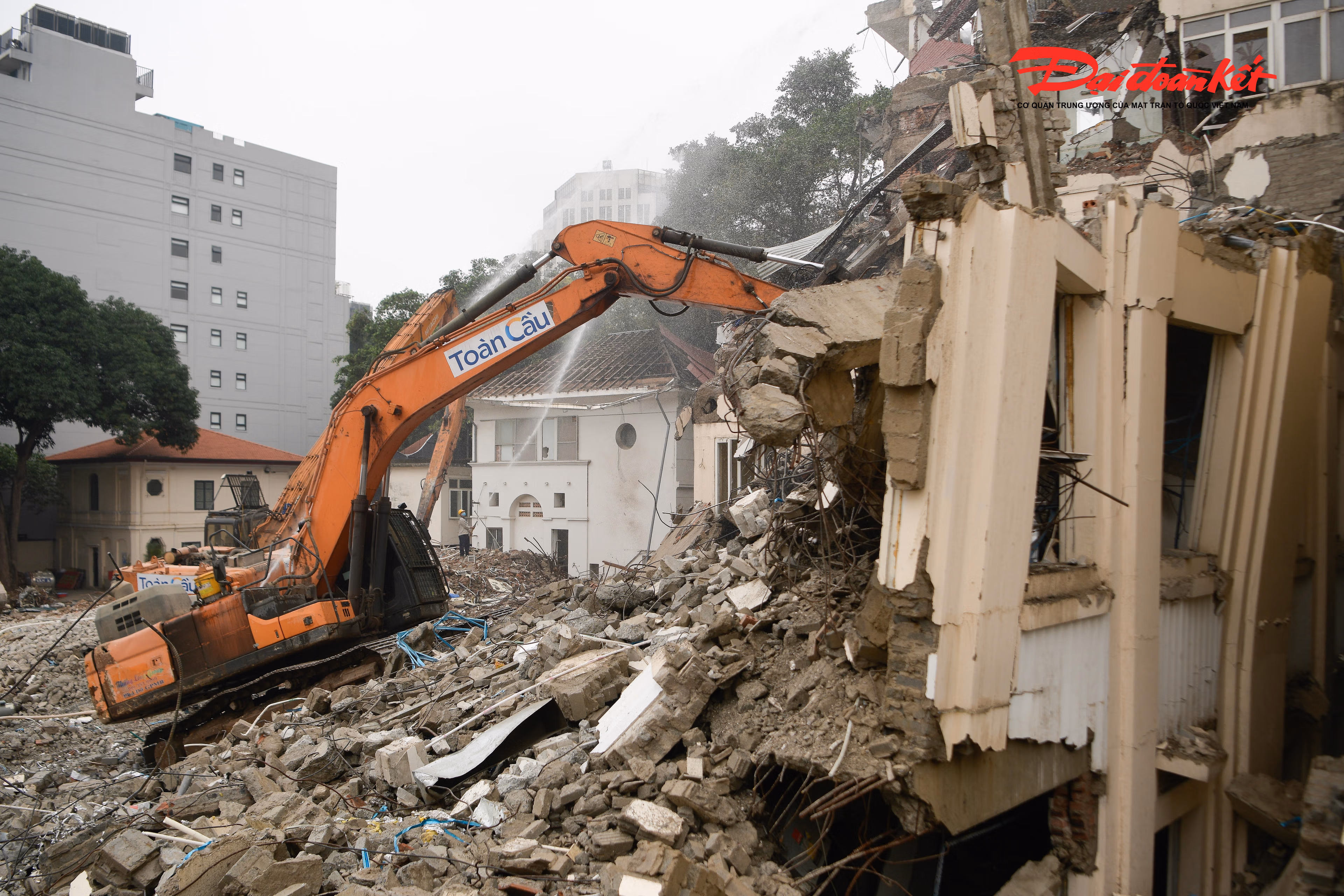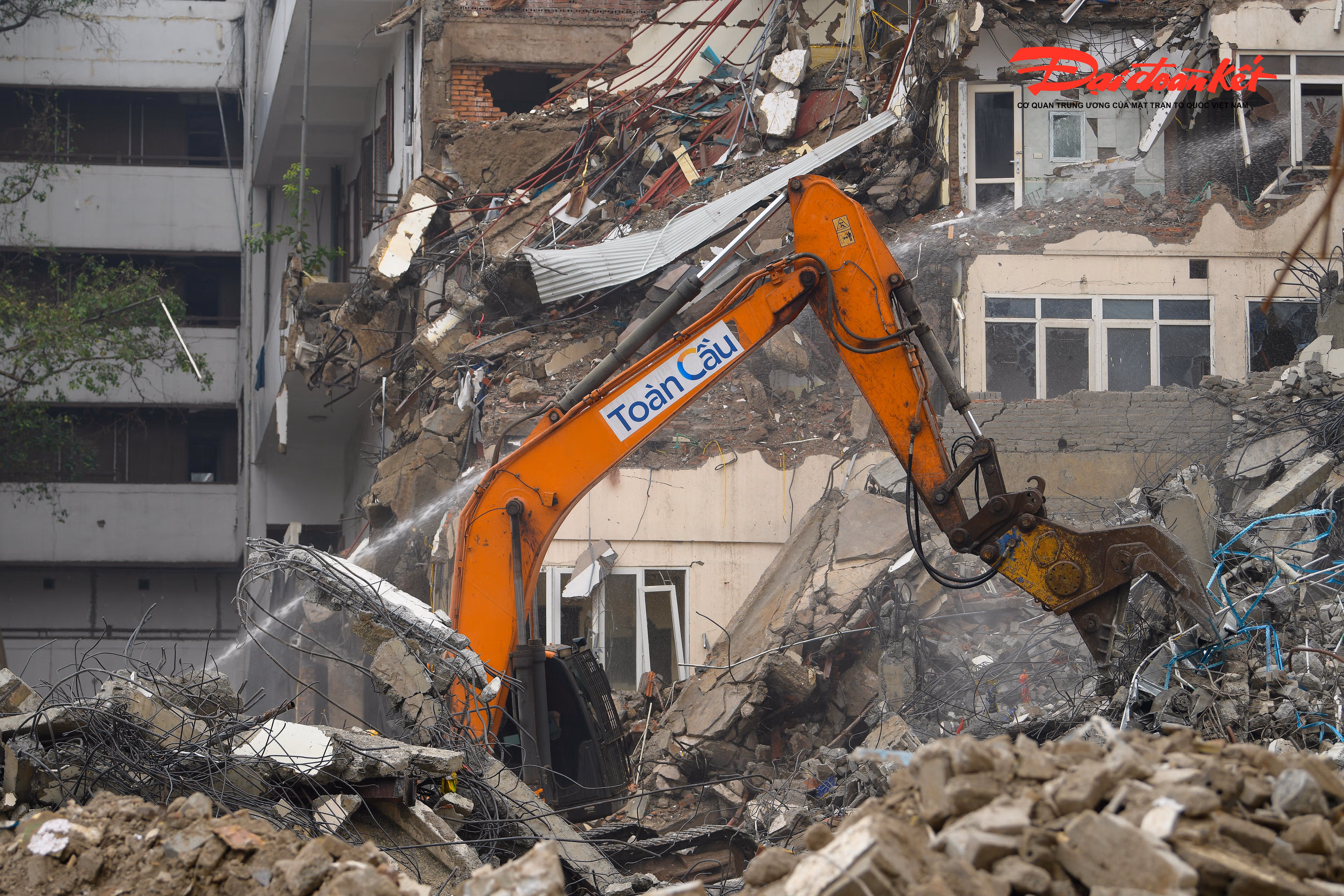 Tại công trường, công nhân làm việc liên tục, phối hợp nhịp nhàng với các phương tiện, máy móc chuyên dụng để xử lý, thu gom và di chuyển vật liệu sau phá dỡ, bảo đảm tiến độ và giữ gìn an toàn trong suốt quá trình thi công.