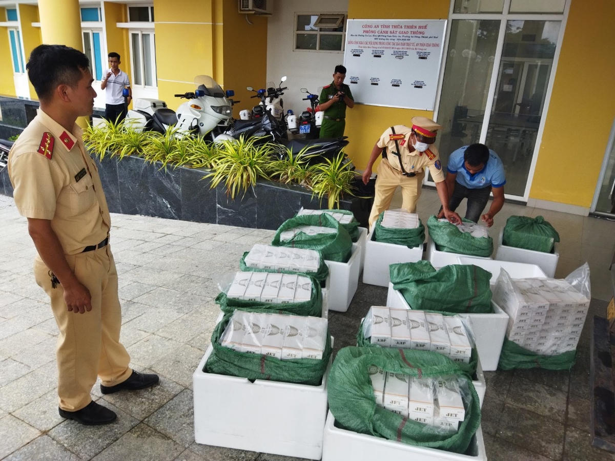 Tại đây, lực lượng Công an phát hiện trên xe đang chở 6.000 bao thuốc lá nhãn hiệu Jet, không có hoá đơn chứng từ kèm theo.