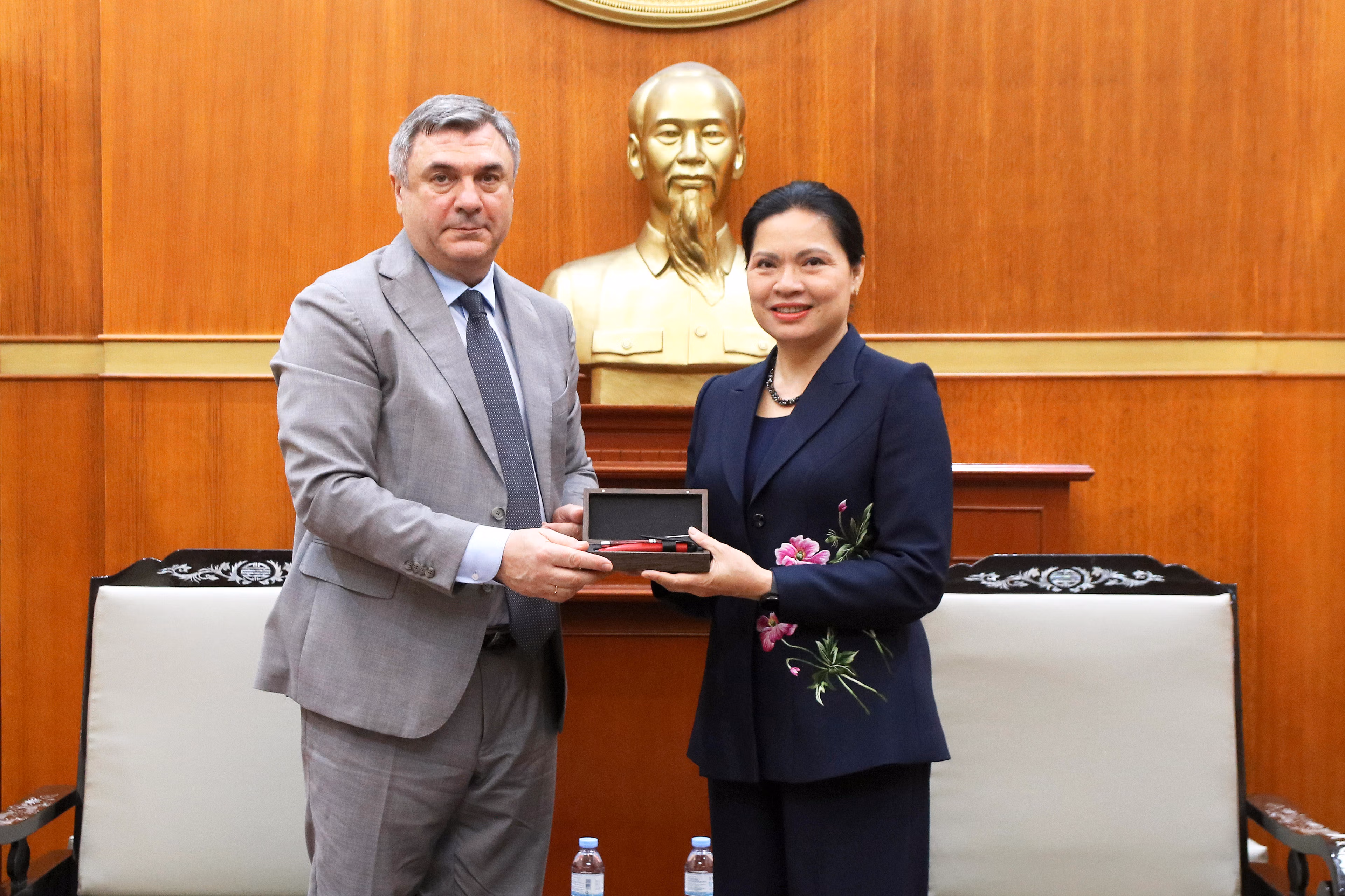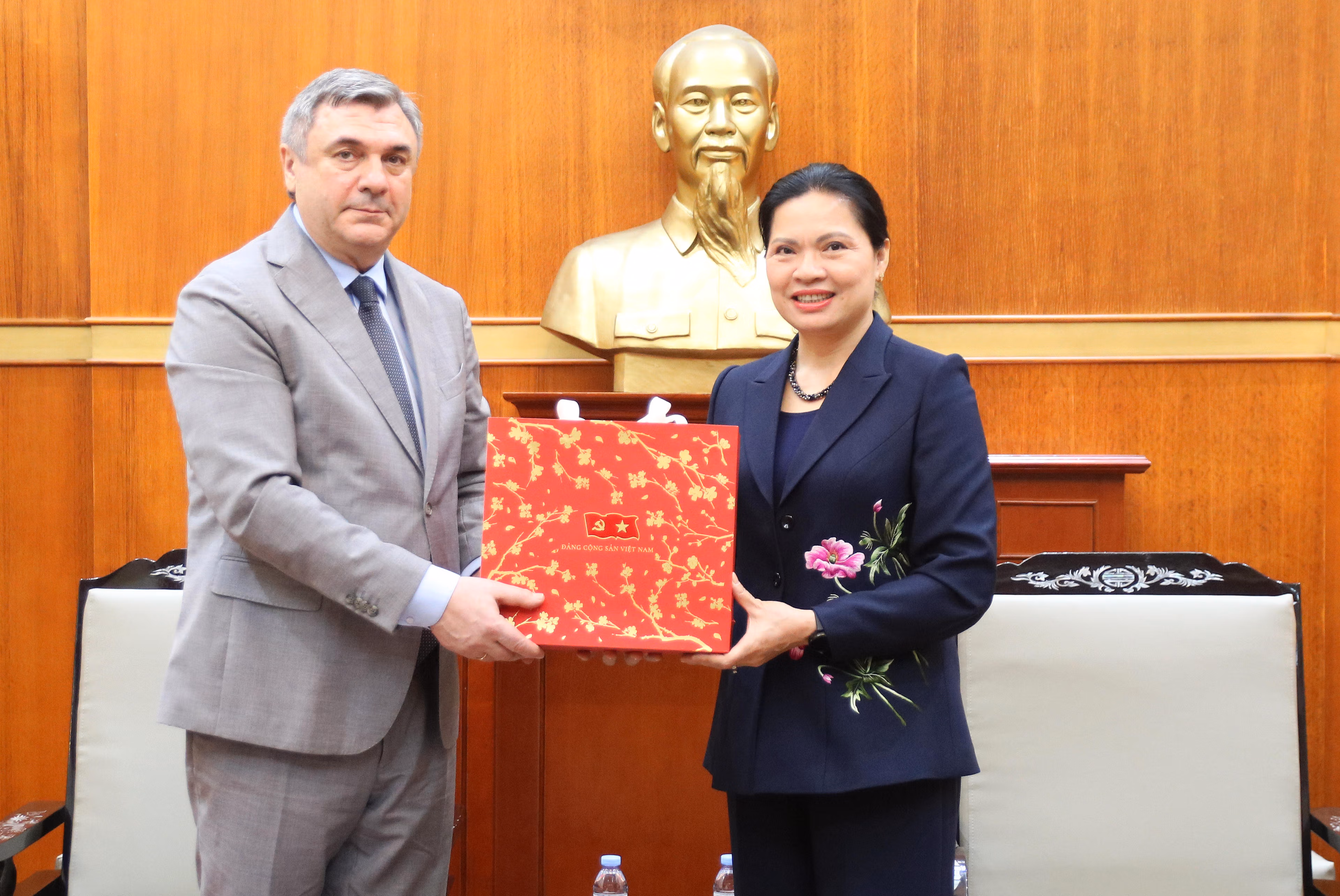 Nhân dịp này, Phó Chủ tịch - Tổng Thư ký Hà Thị Nga chuyển lời chúc mừng tốt đẹp nhất của Ủy viên Bộ Chính trị, Bí thư Trung ương Đảng, Chủ tịch UBTƯ MTTQ Việt Nam Bùi Thị Minh Hoài tới Chủ tịch Ủy ban Đối ngoại thành phố Xanh Pê-téc-bua.