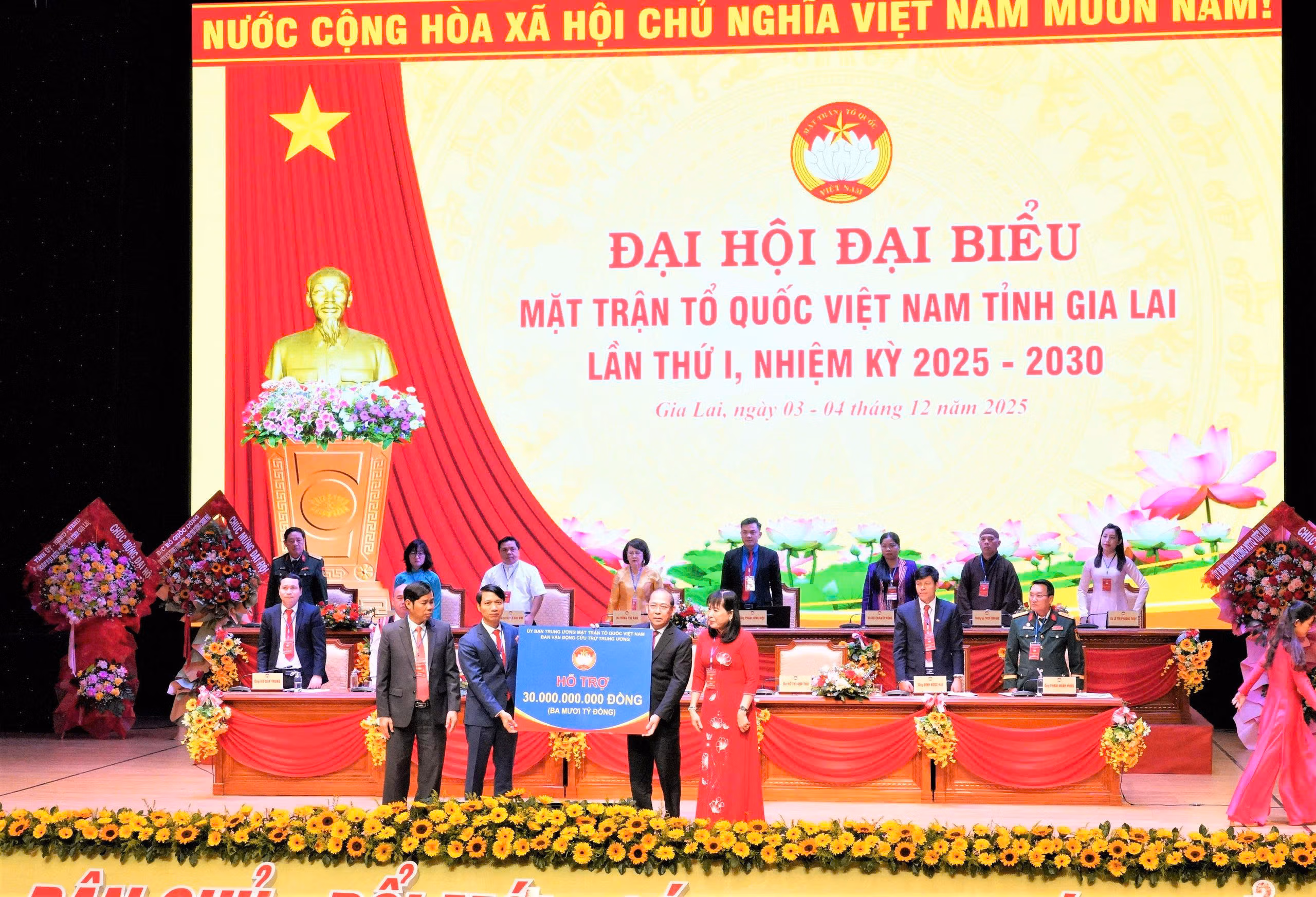 Dịp này, Phó Chủ tịch Ủy ban Trung ương MTTQ Việt Nam Hoàng Công Thủy trao biển tượng trưng hỗ trợ 30 tỷ đồng cho nhân dân tỉnh Gia Lai bị thiệt hại do mưa bão vừa qua từ nguồn Ban Vận động cứu trợ Trung ương.