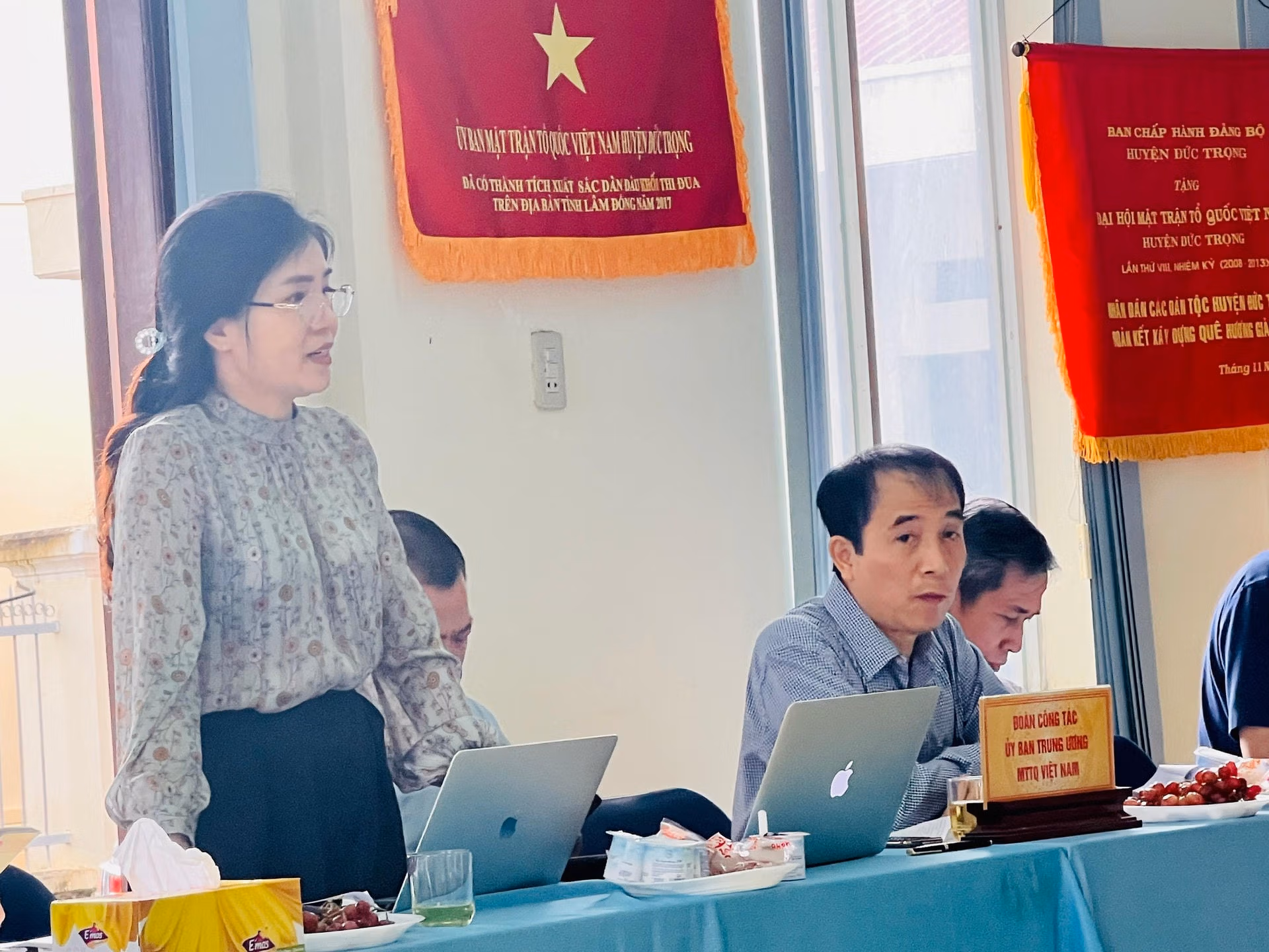 Báo cáo công tác Mặt trận của huyện với Đoàn công tác, ông Lê Công Tuấn, Chủ tịch Ủy ban MTTQ Việt Nam huyện Đức Trọng cho biết: Trong nhiệm kỳ qua, MTTQ Việt Nam các cấp trong huyện và các Tổ chức thành viên đã tiếp tục thực hiện đổi mới nội dung, phương thức hoạt động trong triển khai thực hiện có hiệu quả Nghị quyết Đại hội đại biểu toàn quốc MTTQ Việt Nam lần thứ IX, Nghị quyết Đại hội đại biểu MTTQ Việt Nam tỉnh Lâm Đồng lần thứ VIII và Nghị quyết Đại hội đại biểu MTTQ Việt Nam huyện lần thứ X, nhiệm kỳ 2019-2024 và Chương trình thống nhất hành động của Ủy Ban MTTQ Việt Nam các cấp nhiệm kỳ 2019-2024, hầu hết các chỉ tiêu đều đạt và vượt so với Nghị quyết Đại hội đề ra.