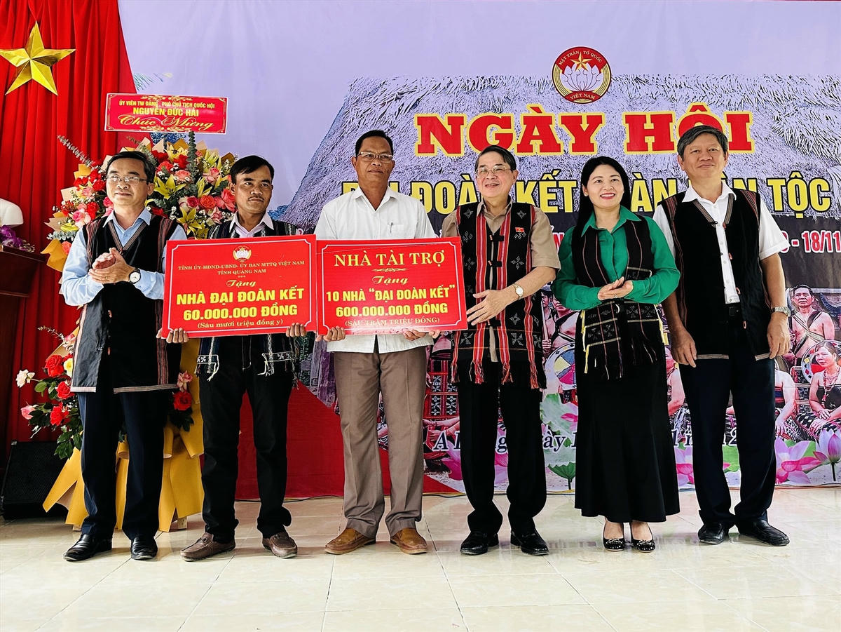 Dịp này, Phó Chủ tịch Quốc hội Nguyễn Đức Hải trao bảng tượng trưng hỗ trợ xây dựng 10 nhà Đại đoàn kết, mỗi nhà trị giá 60 triệu đồng cho huyện Nam Giang; đại diện lãnh đạo tỉnh trao nhà Đại đoàn kết cho 1 hộ gia đình khó khăn thôn A Liêng; cùng nhiều suất quà động viên ý nghĩa cho đồng bào Cơ Tu khó khăn ở thôn A Liêng.
