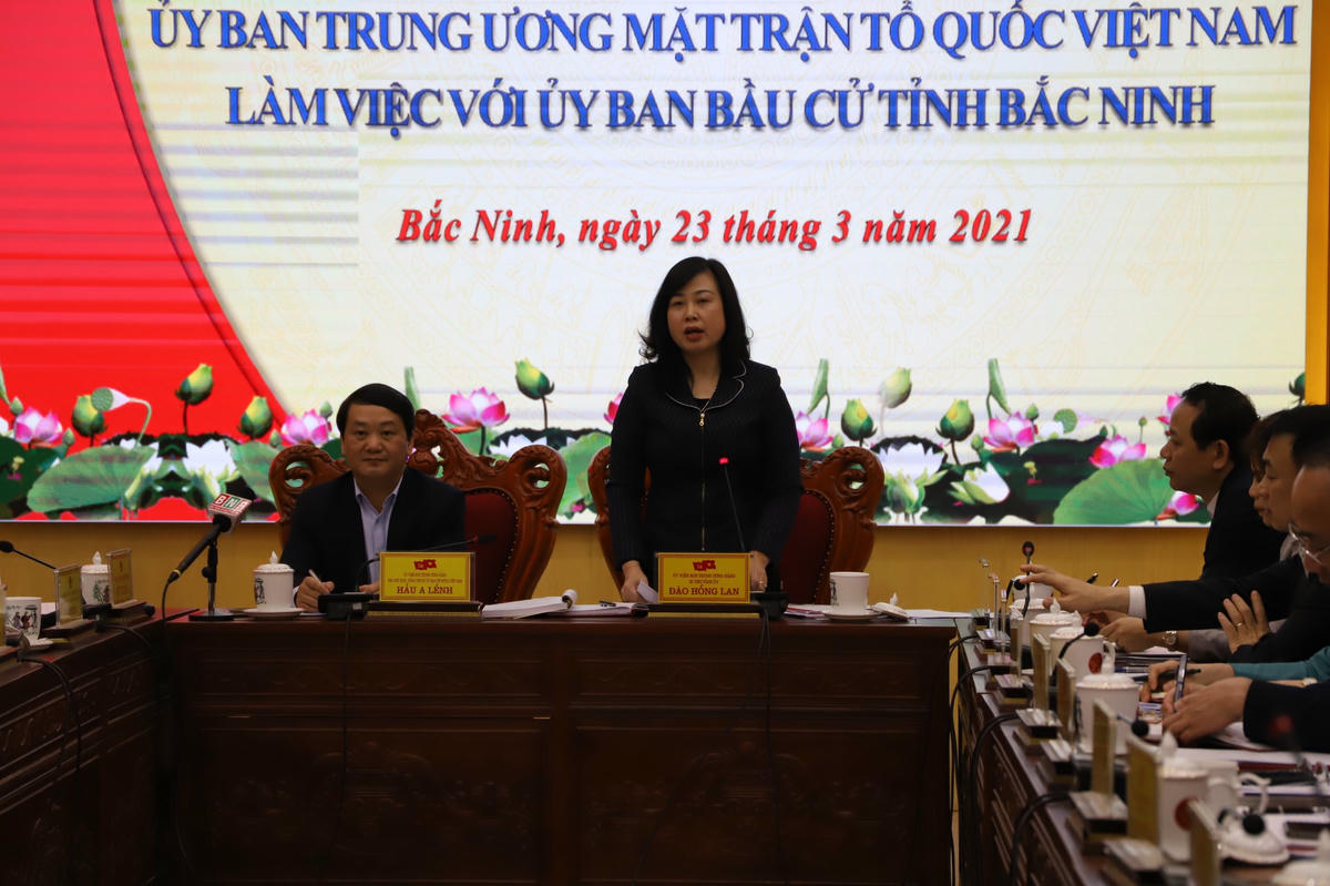 Phát biểu tại cuộc làm việc, Bí thư Tỉnh ủy Bắc Ninh Đào Hồng Lan khẳng định, thời gian qua, công tác lãnh đạo chỉ đạo công tác bầu cử được tỉnh Bắc Ninh tập trung thực hiện quyết liệt. Cụ thể, Tỉnh ủy Bắc Ninh đã tập trung làm tốt công tác định hướng dư luận, tạo sự đồng thuận trong xã hội, quan tâm giải quyết những điểm nóng đơn thư.