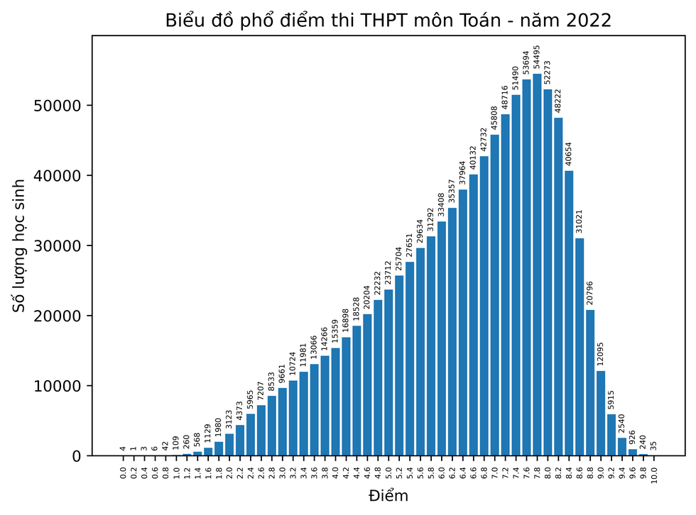 Kết quả phân tích phổ điểm thi tốt nghiệp THPT môn Toán của cả nước năm 2022 cho thấy: Có 982.728 thí sinh tham gia thi bài thi Toán, trong đó điểm trung bình là 6,47 điểm, điểm trung vị là 6,8 điểm; điểm số có nhiều thí sinh đạt nhất là 7,8 điểm. Số thí sinh có điểm <= 1 là 165 (chiếm tỉ lệ 0,02%); số thí sinh đạt điểm dưới trung bình là 186.222 (chiếm tỉ lệ 18,95%).