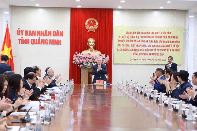 Sáng 20/12, Phó Thủ tướng Thường trực Chính phủ Nguyễn Hòa Bình đã có buổi làm việc với tỉnh Quảng Ninh về tình hình sản xuất kinh doanh, đầu tư công, xuất nhập khẩu, xây dựng hạ tầng, nhà ở xã hội, các chương trình mục tiêu quốc gia và việc thực hiện chính quyền địa phương 2 cấp.