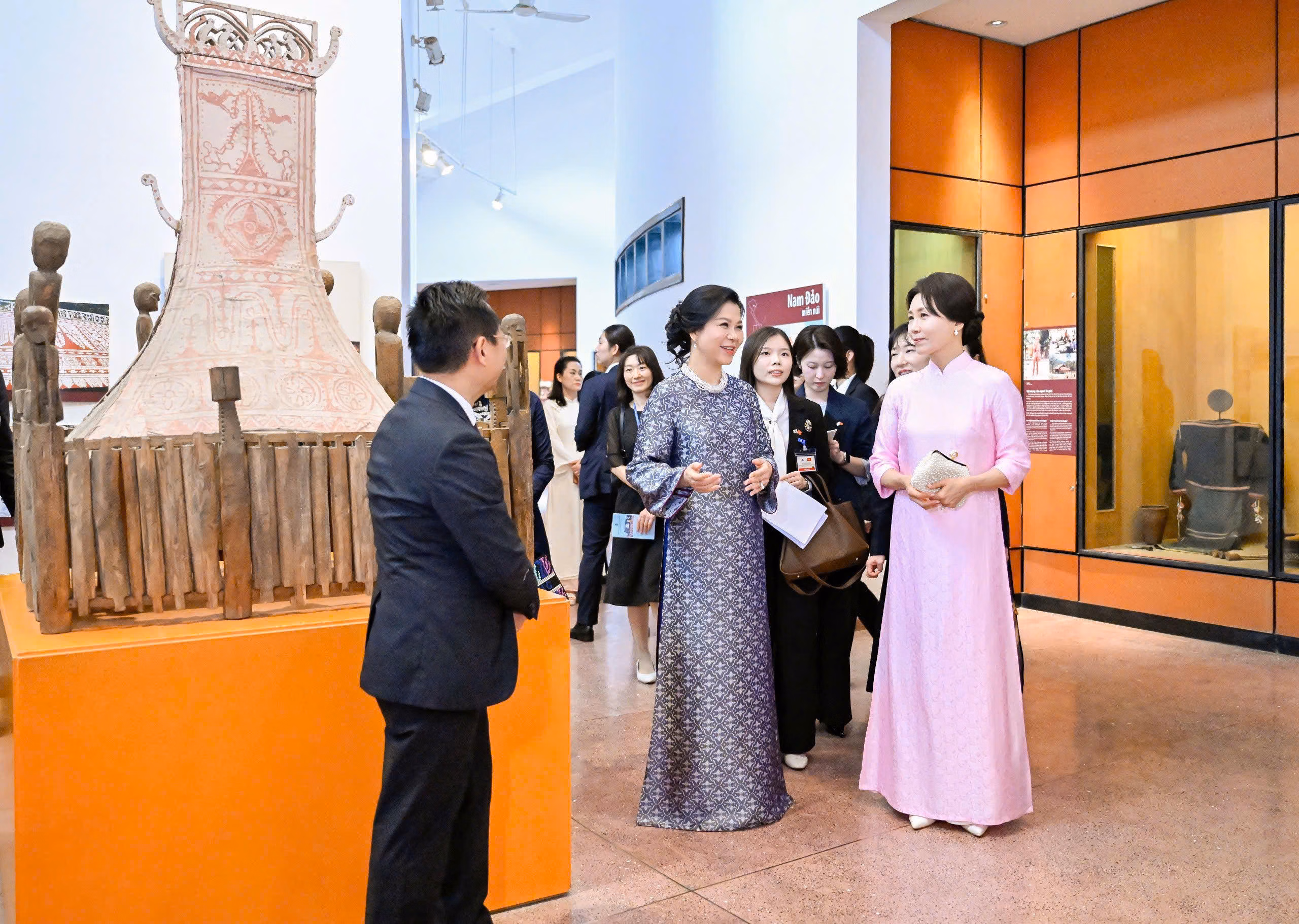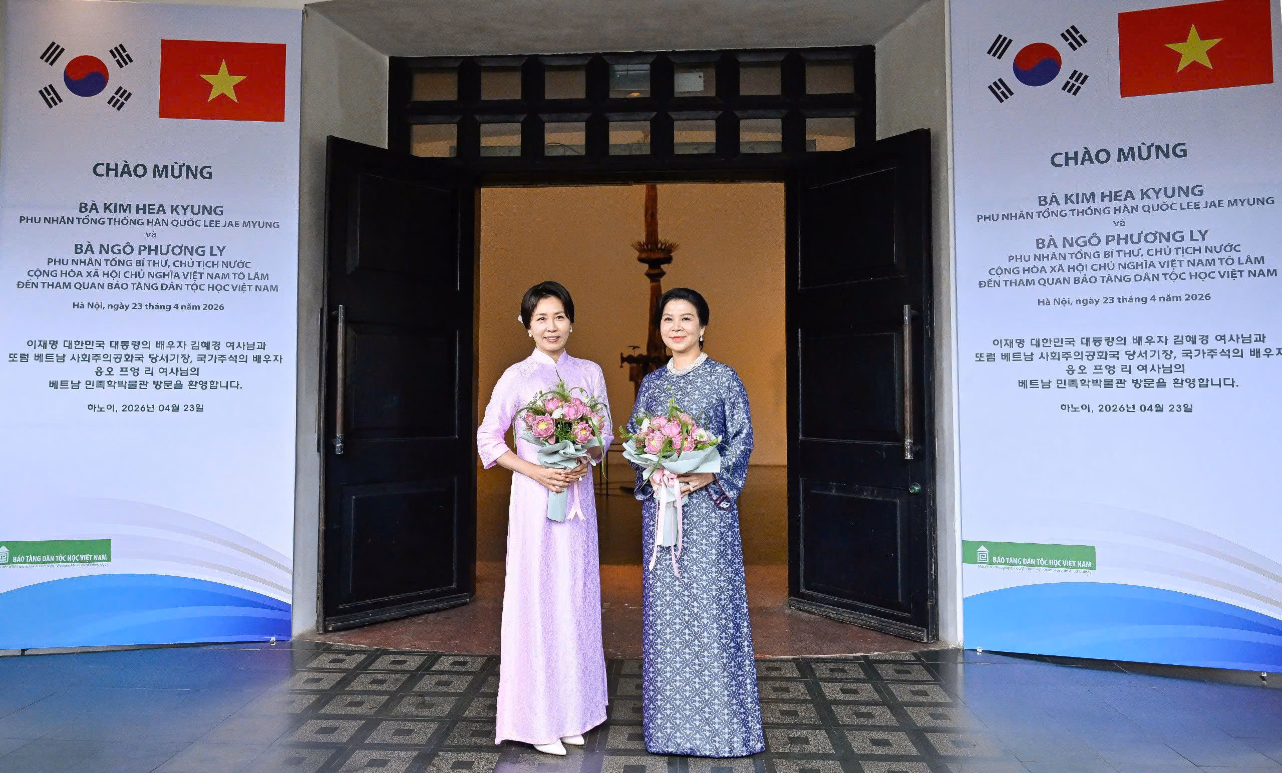 Ngày 23/4, trong khuôn khổ chuyến thăm cấp Nhà nước đến Việt Nam, bà Kim Hye Kyung, Phu nhân Tổng thống Hàn Quốc Lee Jae Myung đã cùng Phu nhân Tổng Bí thư, Chủ tịch nước Tô Lâm - bà Ngô Phương Ly thăm Bảo tàng Dân tộc học Việt Nam.