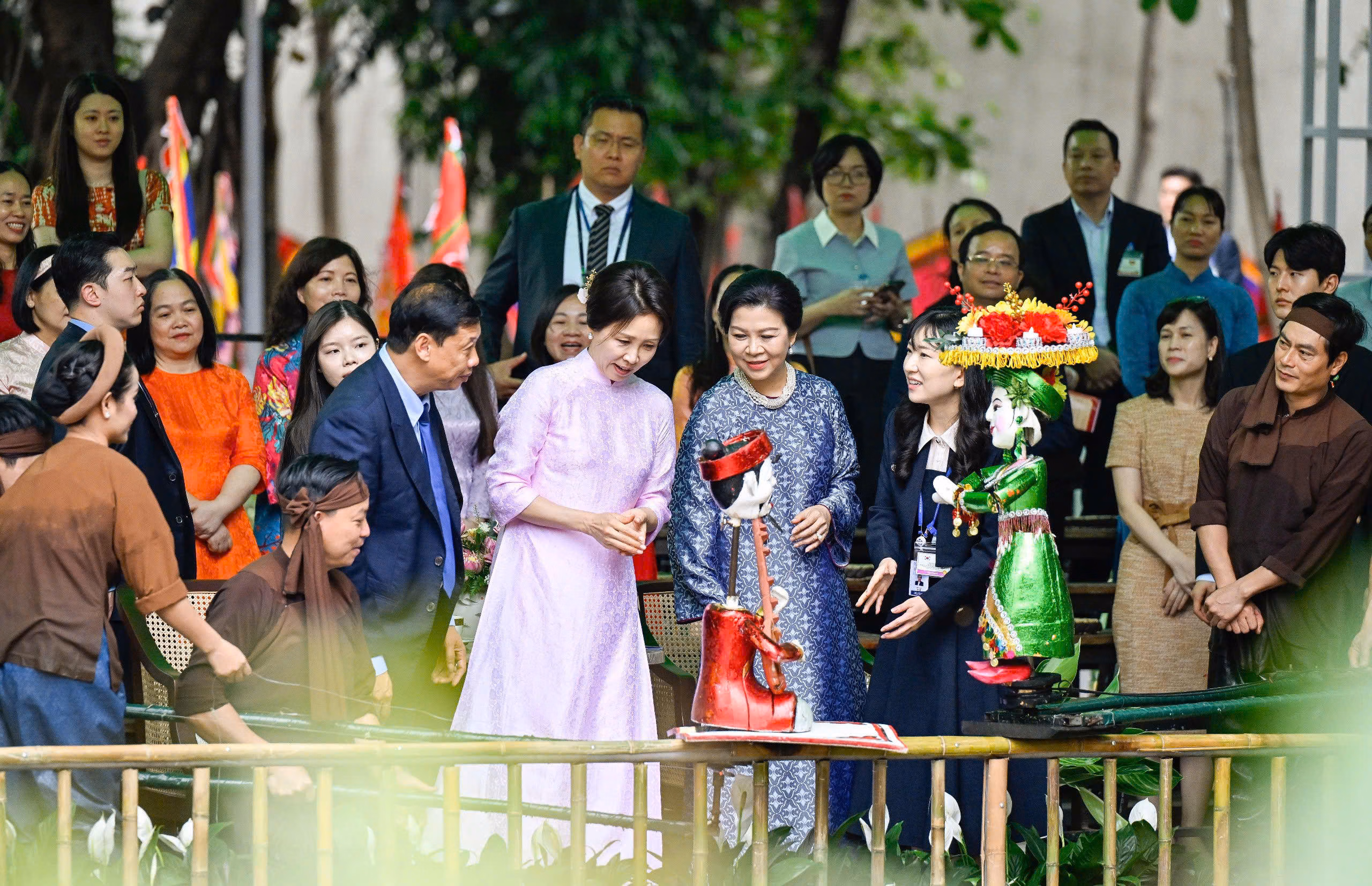 Rời không gian trưng bày hiện vật, Phu nhân Ngô Phương Ly và Phu nhân Kim Hye Kyung đã cùng ngồi lại trò chuyện bên tách trà, thưởng thức một số loại bánh dân gian và các tiết mục múa rối nước Việt Nam.