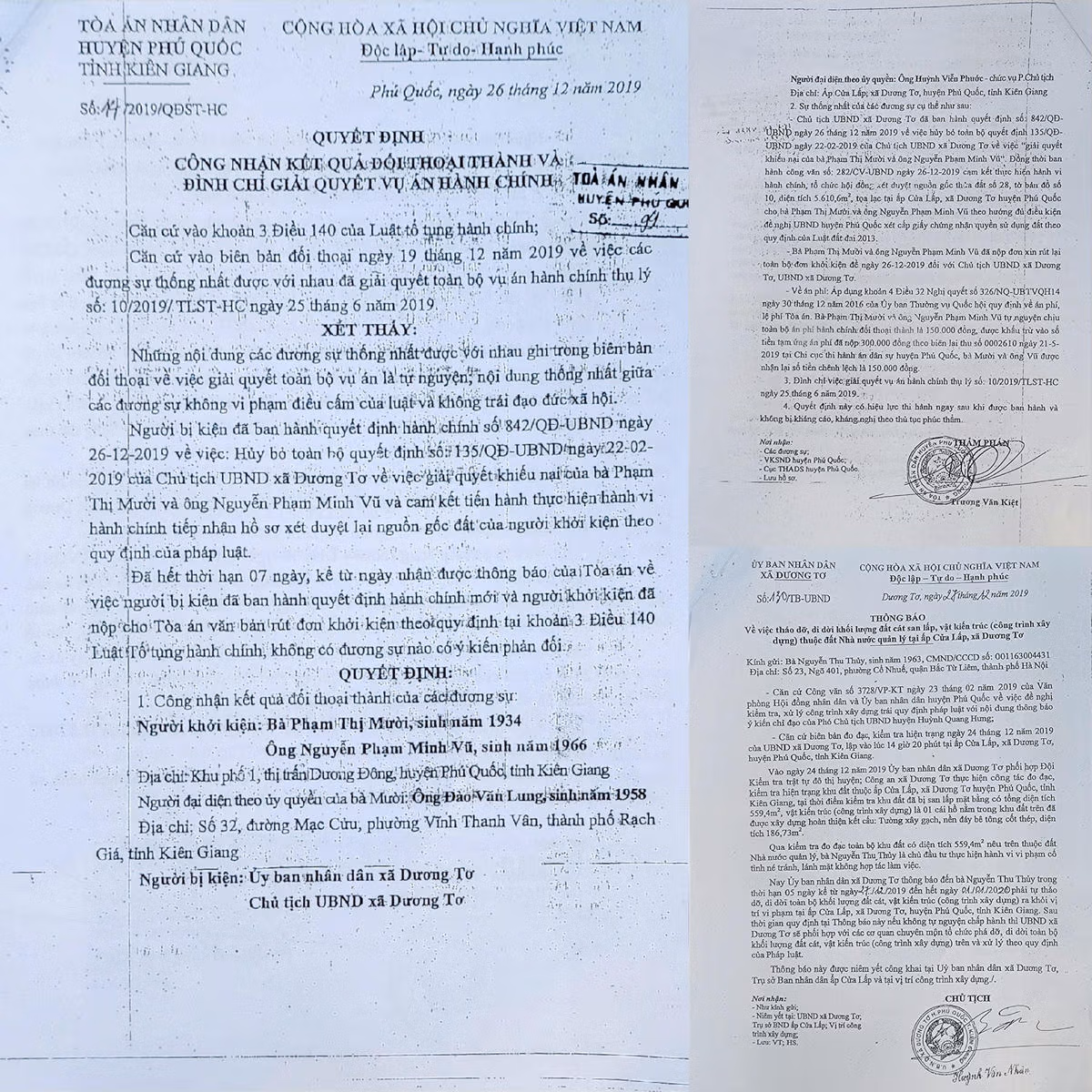 Sau khi nhận được thông báo cưỡng chế, bà Nguyễn Thu Thủy đã “khiếu kiện Quyết định hành chính thuộc trường hợp phá dỡ, di dời vật kiến trúc ra khỏi khu vực đất Nhà nước quản lý” lên Toà án Nhân dân thành phố Phú Quốc, tỉnh Kiên Giang và được Toà án thông báo thụ lý ngày 17/3/2022. Đến ngày 21/3/2022, UBND xã Dương Tơ ra thông báo số 37/TB-UBND về việc “huỷ thông báo số 01 ngày 6/1/2022 của UBND xã Dương Tơ” với lý do “trong quá trình kiểm tra, rà soát lại hồ sơ, biên bản xác minh. Bên phía bộ phận chuyên môn trực thuộc UBND xã Dương Tơ phát hiện hồ sơ còn thiếu sót, chưa đầy đủ thủ tục để ban hành thông báo phá dỡ, di dời công trình, vật kiến trúc.