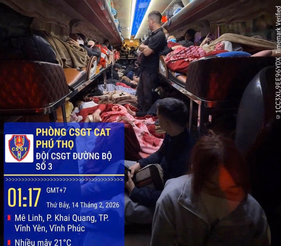 Khoảng 00h24’ ngày 14/2/2026: Kiểm tra xe khách biển số 26B-xxx.23 do Vũ Anh T. (SN 1988, trú tại tỉnh Tuyên Quang) điều khiển, vi phạm: Chở quá số người (73/22 người); Chở hàng hóa vượt kích thước; Thiết bị giám sát hành trình không hoạt động; Xe kinh doanh vận tải hành khách không có phù hiệu.
