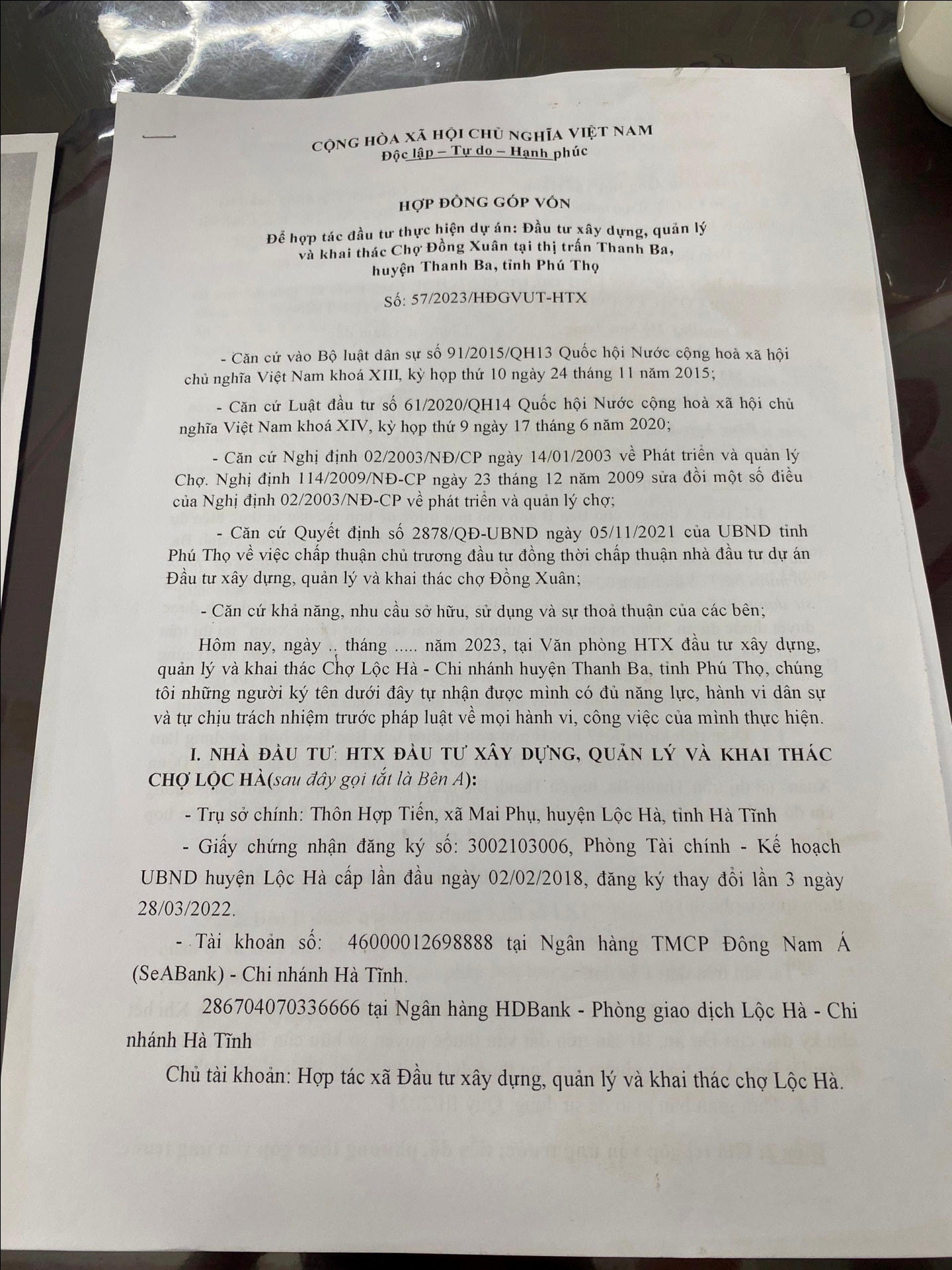 Để lấy được niềm tin, ngoài việc cung cấp Hợp đồng phân phối, phát triển giữa HTX Lộc Hà và Công ty Vũ Khôi, D. còn đưa ra “Hợp đồng góp vốn”, “Phiếu thu” tiền do ông Bùi Thế Hùng – Chủ tịch HĐQT HTX Lộc Hà ký.