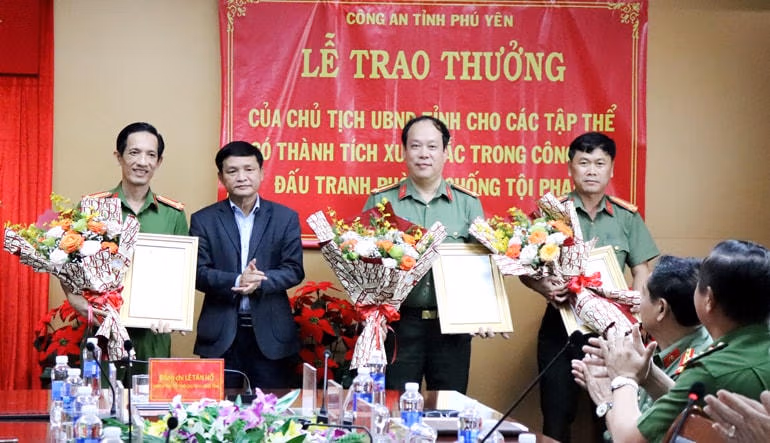Theo đó, ông Lê Tấn Hổ, Ủy viên Ban Thường vụ Tỉnh ủy, Phó Chủ tịch Tthường trực UBND tỉnh Phú Yên đã khen thưởng, chúc mừng thành tích của lực lượng cán bộ, chiến sĩ Công an tỉnh Phú Yên trong công tác đấu tranh phòng chống tội phạm và trao thư khen của Chủ tịch UBND tỉnh Phú Yên Tạ Anh Tuấn cho các tập thể có thành tích xuất sắc trong tham gia đấu tranh, phá án, bao gồm: Phòng Cảnh sát hình sự (CSHS), Phòng An ninh mạng và phòng chống tội phạm sử dụng công nghệ cao - Công an tỉnh Phú Yên, Cục An ninh mạng và phòng chống tội phạm sử dụng công nghệ cao - Bộ Công an.