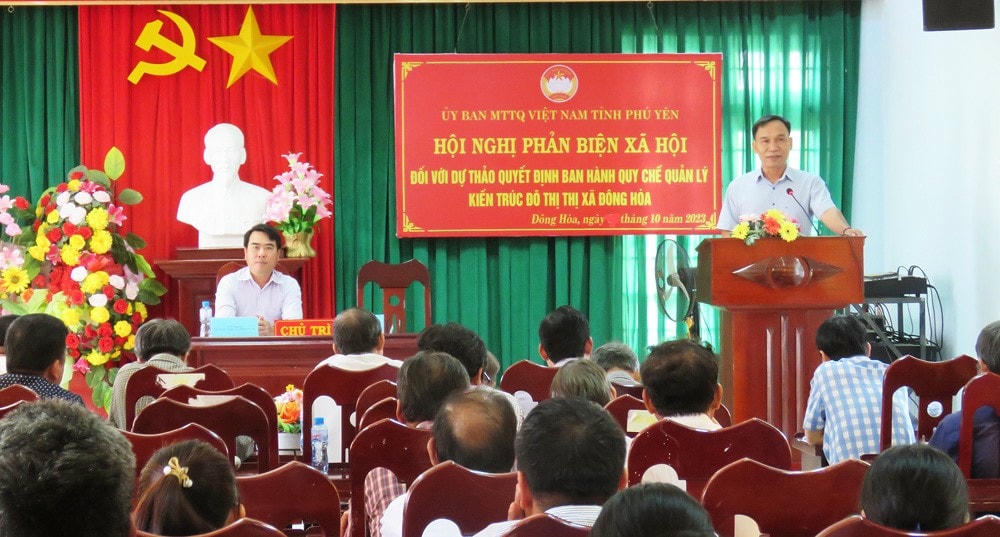 Ngày 8/10, Ủy ban MTTQ Việt Nam tỉnh Phú Yên cho biết, vừa tổ chức hội nghị phản biện xã hội đối với dự thảo Quyết định ban hành quy chế quản lý kiến trúc đô thị TX Đông Hòa (Phú Yên). Ông Nguyễn Quốc Hoàn, Ủy viên Ban Thường vụ Tỉnh ủy, Chủ tịch Ủy ban MTTQ Việt Nam tỉnh Phú Yên, ông Hồ Hồng Nam, Phó Chủ tịch thường trực Ủy ban MTTQ Việt Nan tỉnh Phú Yên chủ trì hội nghị.