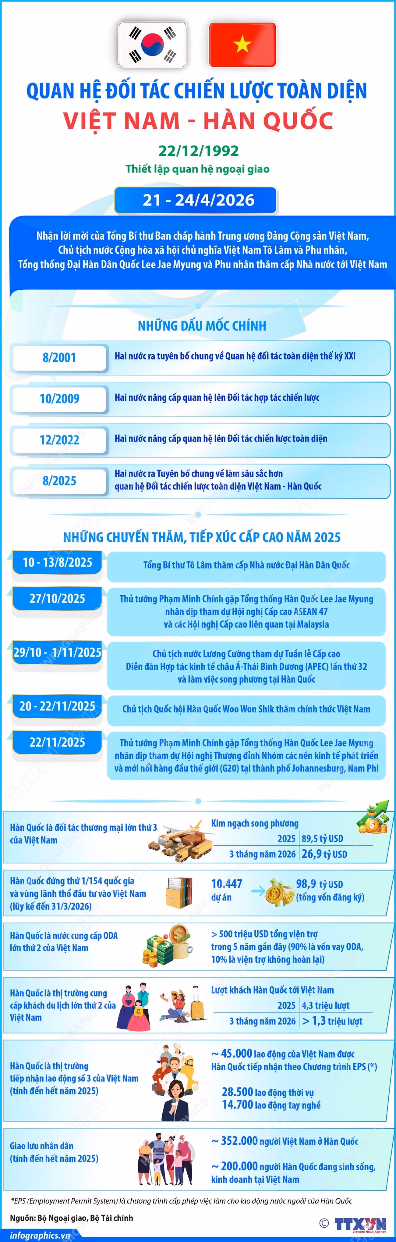 Nhận lời mời của Tổng Bí thư Ban chấp hành Trung ương Đảng Cộng sản Việt Nam, Chủ tịch nước Cộng hòa xã hội chủ nghĩa Việt Nam Tô Lâm và Phu nhân, Tổng thống Đại Hàn Dân Quốc Lee Jae Myung và Phu nhân thăm cấp Nhà nước tới Việt Nam từ ngày 21 đến 24/4/2026.
