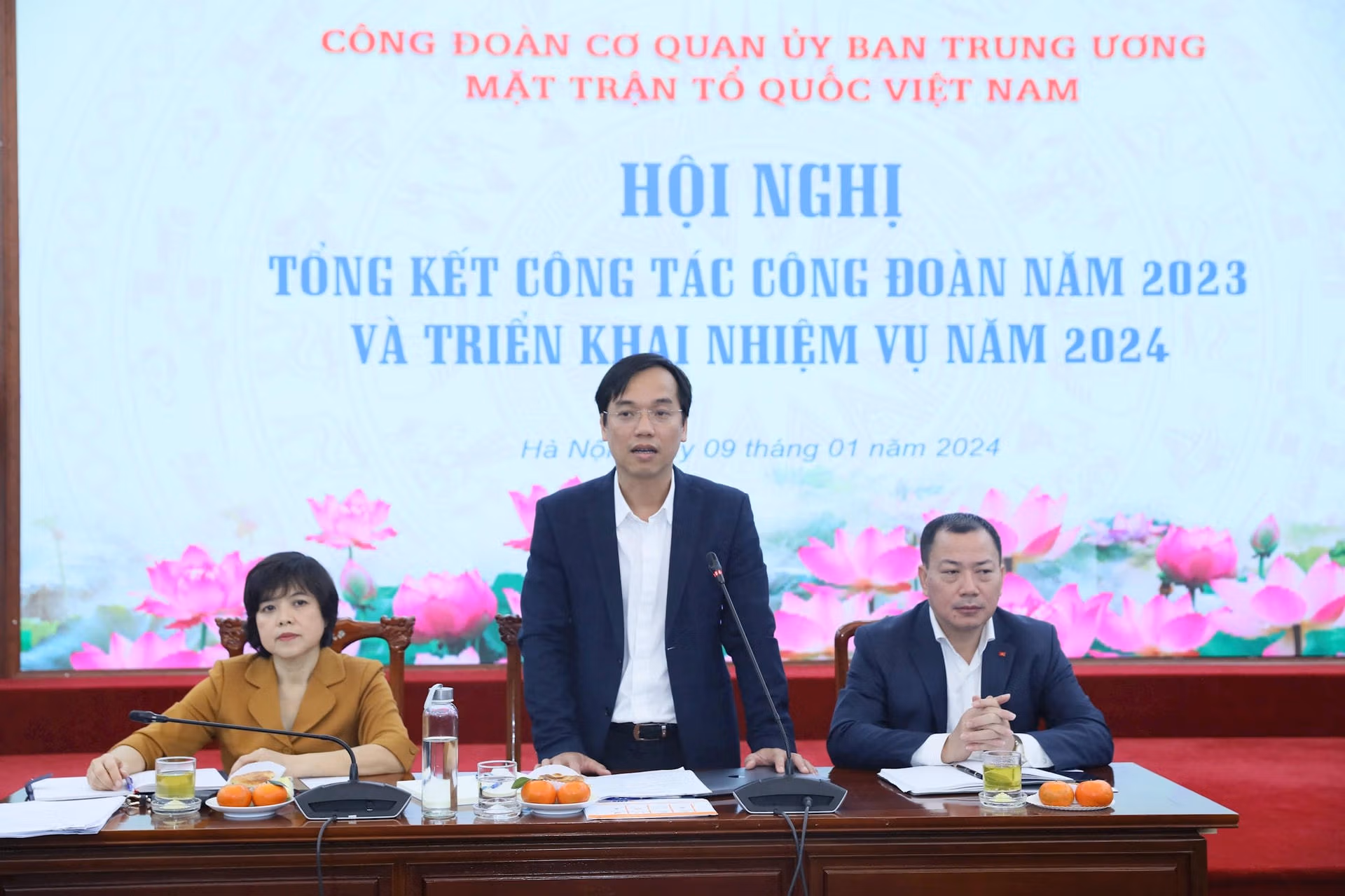 Phát biểu tại hội nghị, ông Nguyễn Bình Minh, Chủ tịch Công đoàn cơ quan Trung ương MTTQ Việt Nam ghi nhận và biểu dương trong năm 2023, Công đoàn cơ quan, Công đoàn các ban, đơn vị đã khắc phục khó khăn, lựa chọn triển khai có trọng tâm, trọng điểm các nhiệm vụ đạt nhiều kết quả tích cực, có nhiều nét khởi sắc gắn liền với năm đặc thù là năm Đại hội Công đoàn của các đơn vị, Công đoàn cơ quan Trung ương MTTQ Việt Nam.