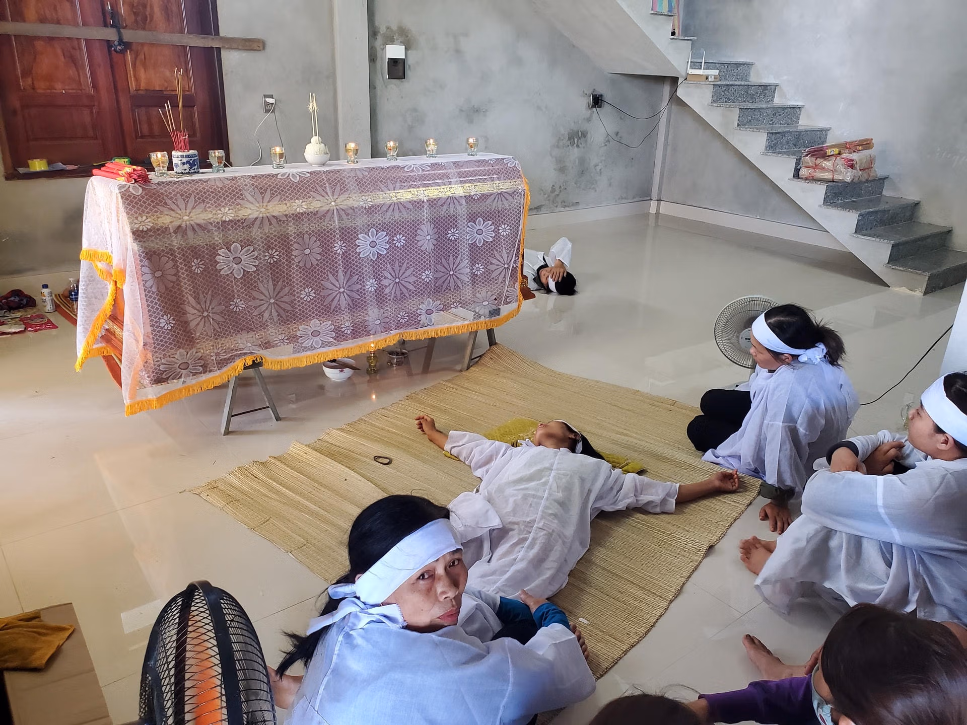 Không khí trong nhà ngập mùi nhang, khá nặng nề, chìm trong tiếng khóc thương ai oán của những người thân phủ phục bên quan tài của 3 gia đình. Trước nỗi đau quá lớn, họ phải tự vỗ về, an ủi nhau vượt qua để sống tiếp...