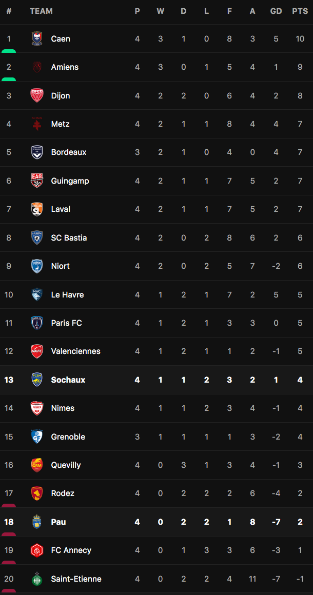 Sau 4 trận đấu ở Ligue 4, Pau FC đang đứng thứ 18 với 2 điểm. Ngay từ đầu mùa giải, đoàn quân HLV Didier Tholot sớm đối diện với nguy cơ phải đua trụ hạng.