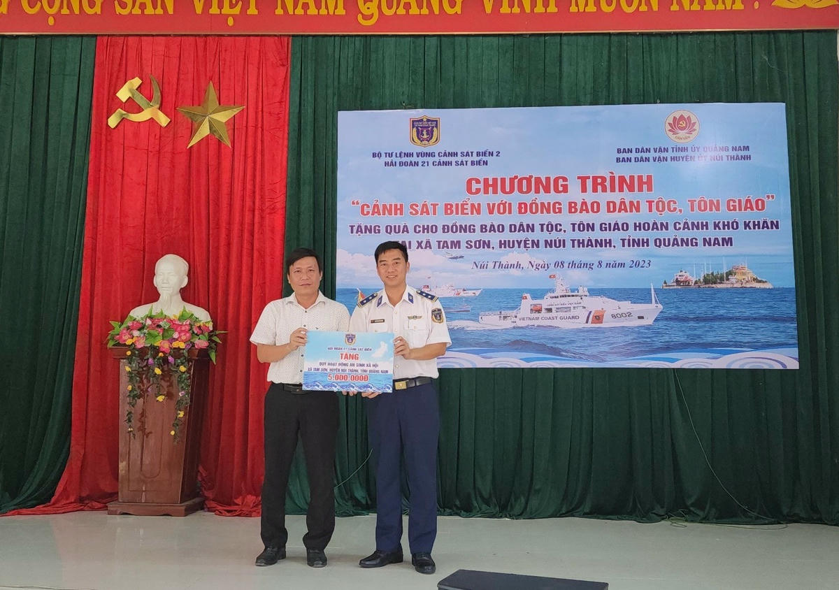 Ngày 8/8, Hải đoàn 21, Bộ tư lệnh Vùng Cảnh sát biển 2, đóng tại huyện Núi Thành, tỉnh Quảng Nam đã phối hợp với Ban Dân vận Tỉnh ủy Quảng Nam, Ban Dân vận huyện ủy Núi Thành tổ chức Chương trình công tác dân vận “Cảnh sát biển với đồng bào dân tộc, tôn giáo” tại xã Tam Sơn, huyện Núi Thành.