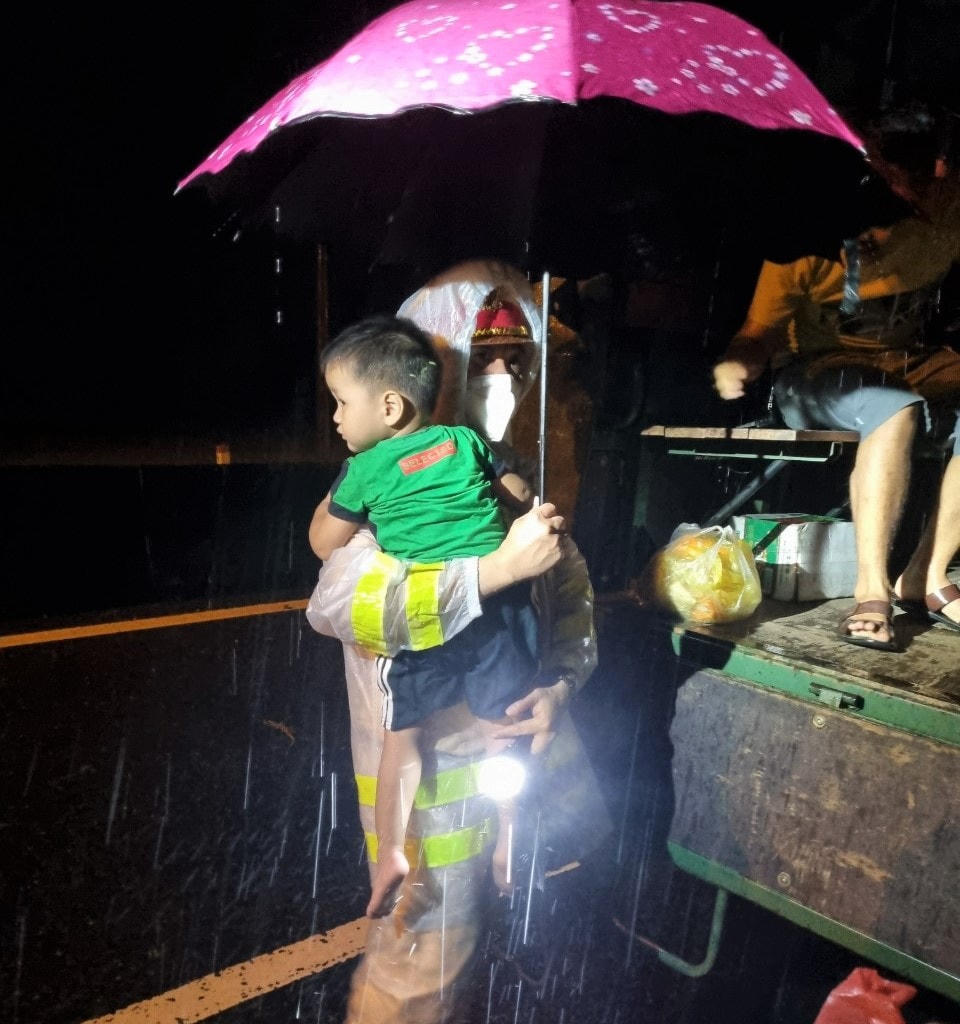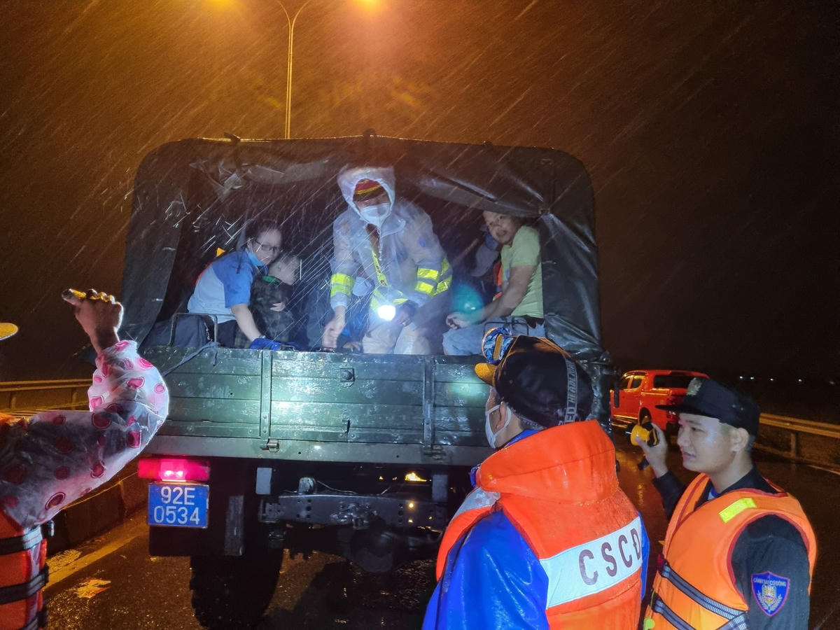 Trước đó, vào khoảng 20h tối 23/10, Phòng CSGT đường bộ, đường sắt Công an tỉnh Quảng Nam nhận được thông tin cầu cứu của hàng chục người dân về việc họ cùng hàng chục phương tiện đang bị mắc kẹt giữa dòng nước lũ tại Km 985+998, trên tuyến Quốc lộ 1, đoạn qua xã Tam An, huyện Phú Ninh, tỉnh Quảng Nam.