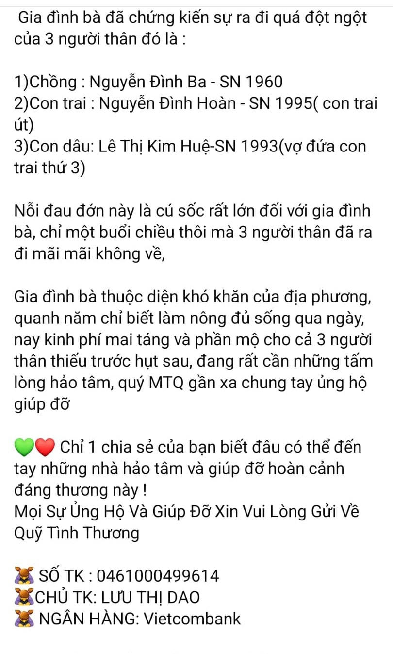 Để tạo lòng tin với mọi người, bài viết còn đăng kèm hình ảnh 3 nạn nhân đã qua đời. Kèm theo nội dung bài viết là số tài khoản 0461000499614, chủ tài khoản tên Lưu Thị Dao, mở tại ngân hàng Vietcombank, kêu gọi mọi người gửi tiền ủng hộ.