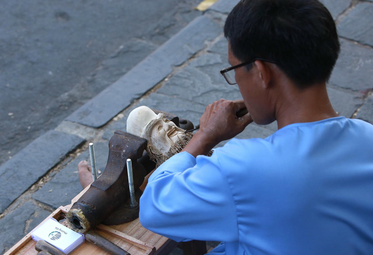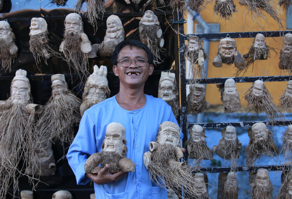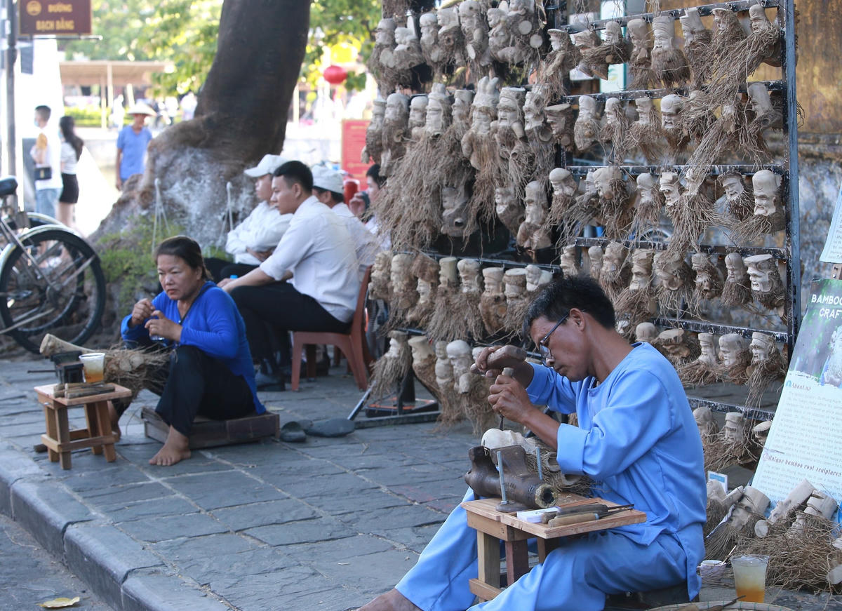 Khi chúng tôi đến thăm anh Huỳnh Phương Đổ đang ngồi điêu khắc gốc tre bên đường ở phố cổ Hội An, anh Đỏ chia sẻ, anh đã có 20 năm làm nghề điêu khắc và đã chế tác ra hàng nghìn tác phẩm độc đáo từ gốc tre và đã thu hút rất nhiều du khách đến tham quan, chiêm ngưỡng.