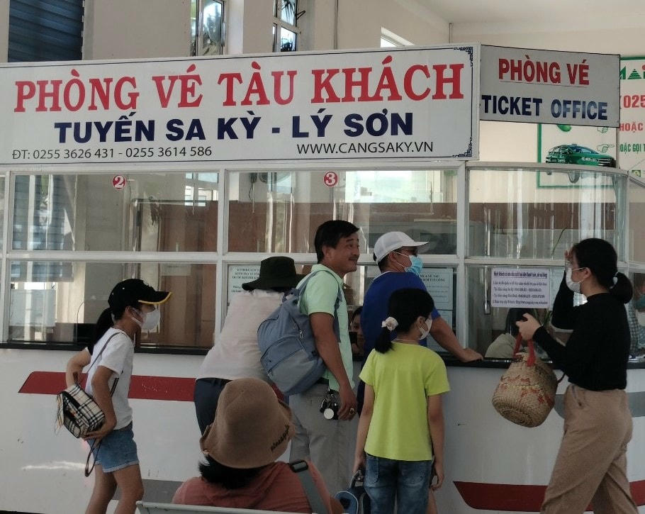 Ghi nhận của chúng tôi, trưa cùng ngày, tại cảng Sa Kỳ cũng có rất đông hành khách đến các quầy để mua vé và làm thủ tục, sau đó mọi người xếp hàng dài để lên tàu cao tốc ra đảo Lý Sơn thăm quan, du lịch trong dịp lễ Quốc khánh 2-9.