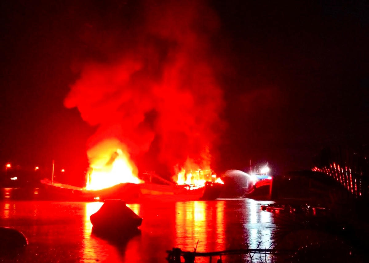 Tại hiện trường, lực lượng chữa cháy đã khẩn trương cứu chữa, không để dầu máy chảy lan ra ngoài, vì vô cùng nguy hiểm khi có hàng chục tàu cá đang neo đậu xung quanh con tàu bị cháy.