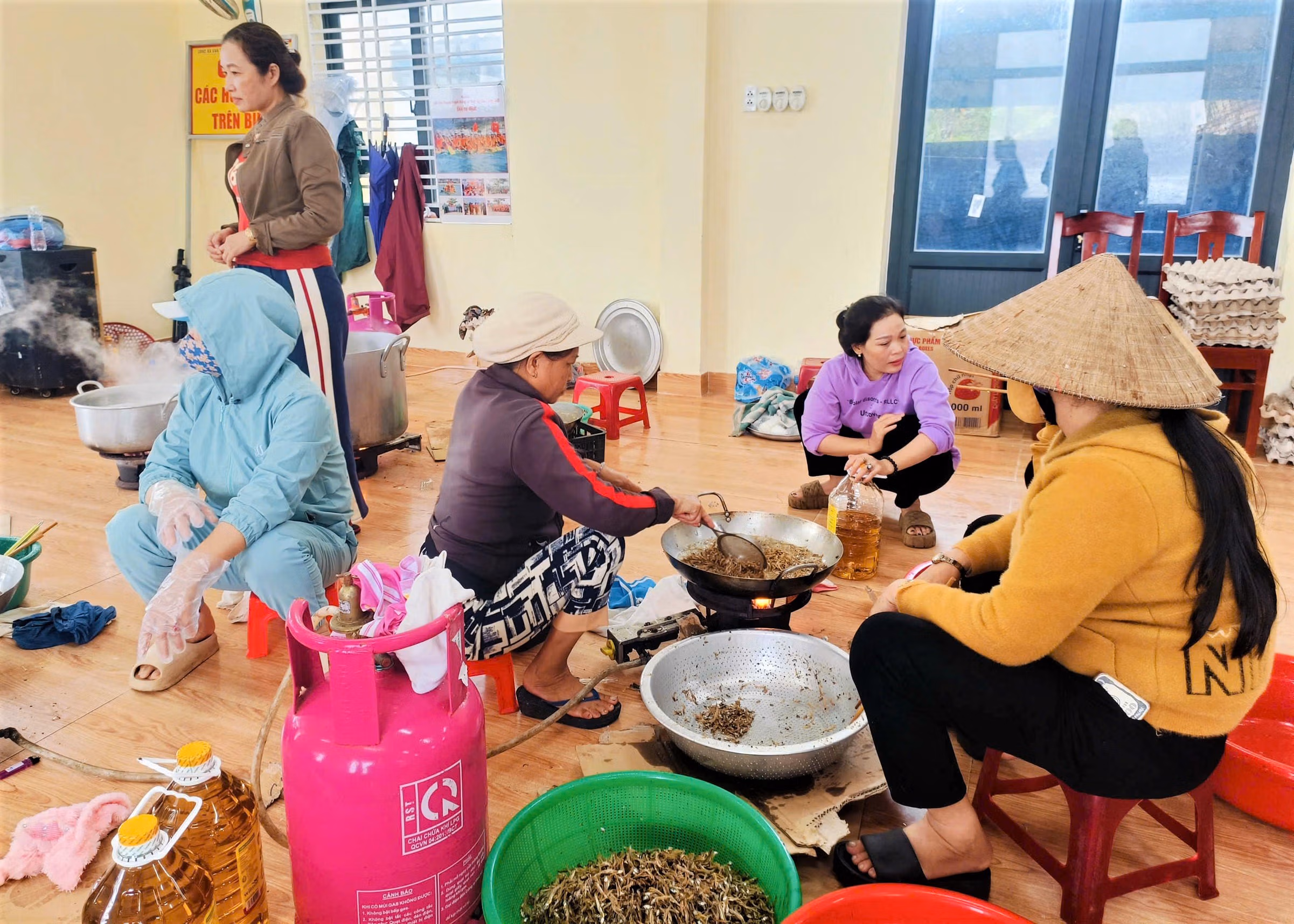 Tại thôn Phước Thiện 1, xã Vạn Tường, tỉnh Quảng Ngãi, người dân hướng về vùng lũ bằng sự cảm thông và sẻ chia. Từ đêm 22 đến nay, nhà văn hóa thôn trở nên nhộn nhịp, mỗi người một tay, tất bật chuẩn bị từng mẻ cá cơm rim để đóng gói gửi đến người dân vùng ngập lụt.
