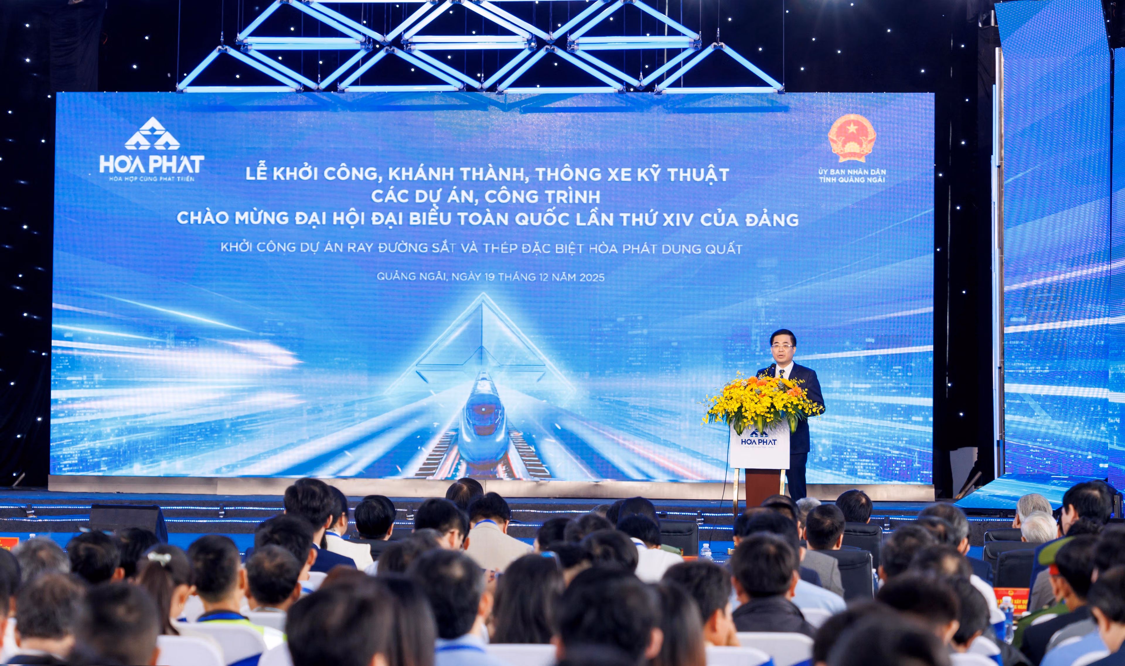 Phát biểu tại lễ khởi công, ông Nguyễn Hoàng Giang, Chủ tịch UBND tỉnh Quảng Ngãi khẳng định, đề xuất đầu tư Dự án Nhà máy sản xuất ray đường sắt và thép đặc biệt Hòa Phát Dung Quất là hoàn toàn phù hợp với định hướng phát triển của tỉnh Quảng Ngãi cũng như chủ trương của Chính phủ.