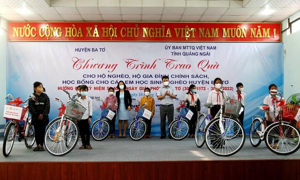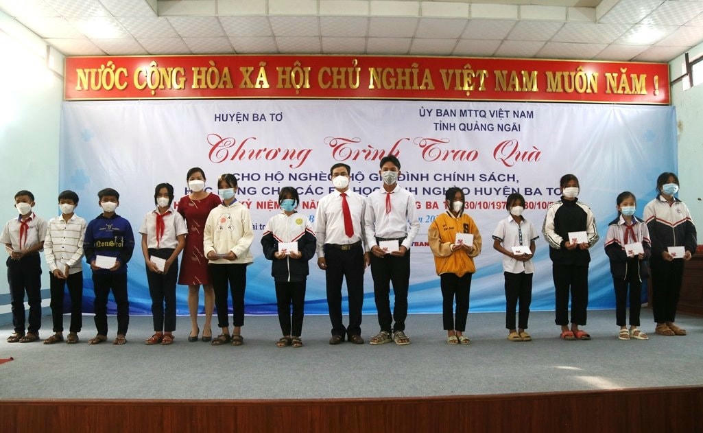 Nhân Kỷ niệm 50 năm ngày khởi nghĩa Ba Tơ (11/3/1945 - 11/3/2022), Ủy ban MTTQ Việt Nam tỉnh Quảng Ngãi đã phối hợp với huyện Ba Tơ tổ chức chương trình trao quà cho hộ nghèo, gia đình chính sách, trao học bổng cho các em học sinh.